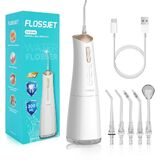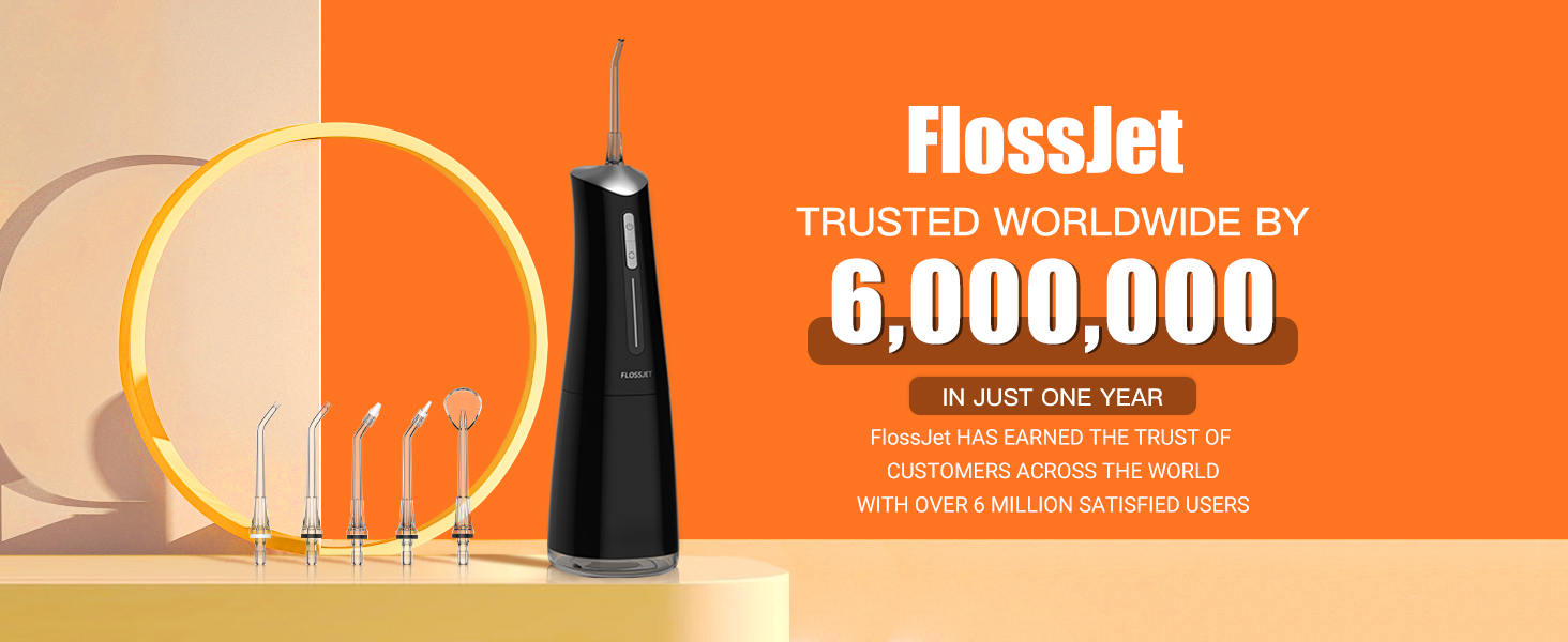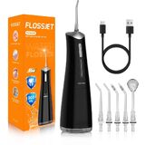 5 Professional 360° Rotating Tips: FlossJet Portable water flosser is equipped with 2 standard tips for daily oral hygiene; 1 orthodontic tip specifically designed for individuals with braces; 1 periodontal pocket tip for deep cleaning of the gums; and 1 tongue scraper tip that helps freshen breath. The combination of 360° rotating tips and high-pressure water pulses provides more effective cleaning for both teeth and dentures.