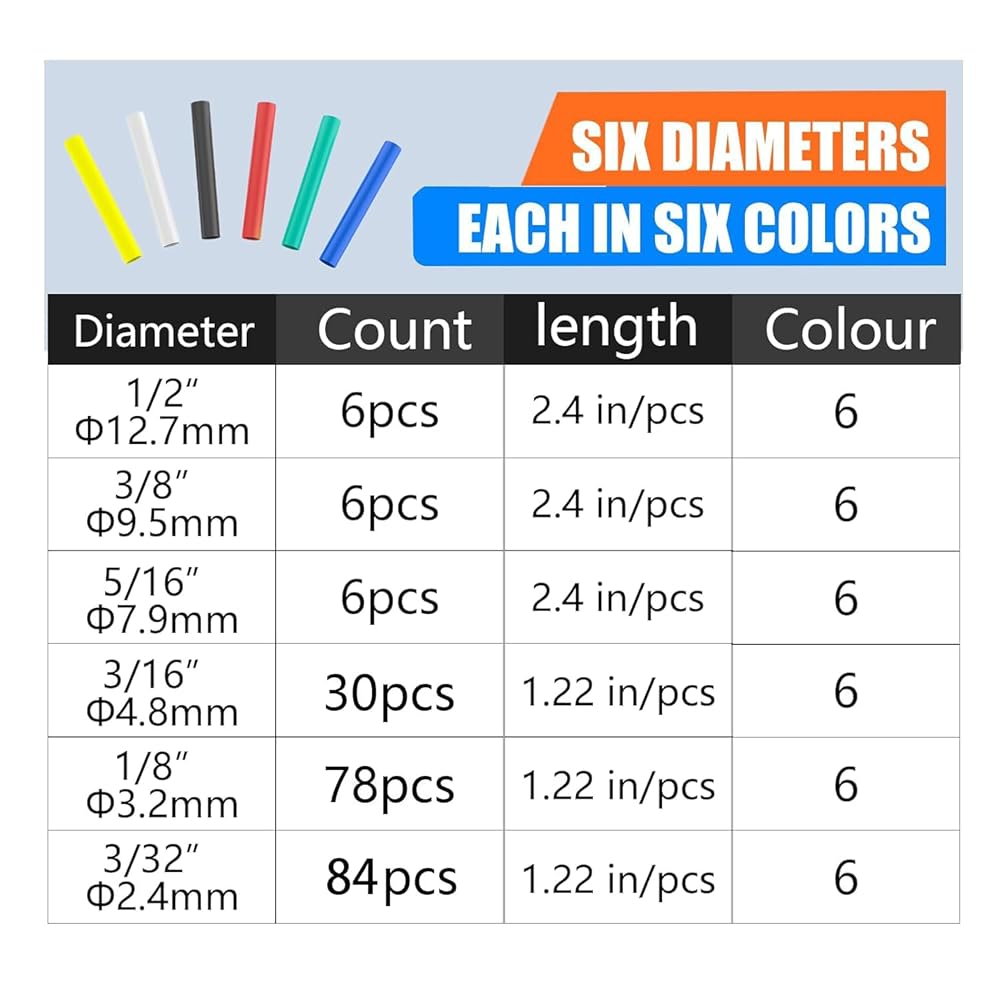 SPECIFICATIONS & QUANTITY: Eugiichr Heat Shrink Tubing Kit contains 6 pcs of 1/2" (2.4" long), 6 pcs of 3/8" (2.4" long), 6 pcs of 5/16" (2.4" long), 30 pcs of 3/16" (1.22" long), 78 pcs of 1/8" (1.22" long) and 84 pcs of 3/32" (1.22" long), This heat shrink tubing kit includes six diameters, each in six colors (black, red, blue, yellow, green, white).