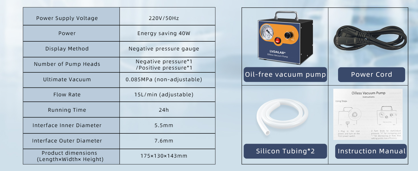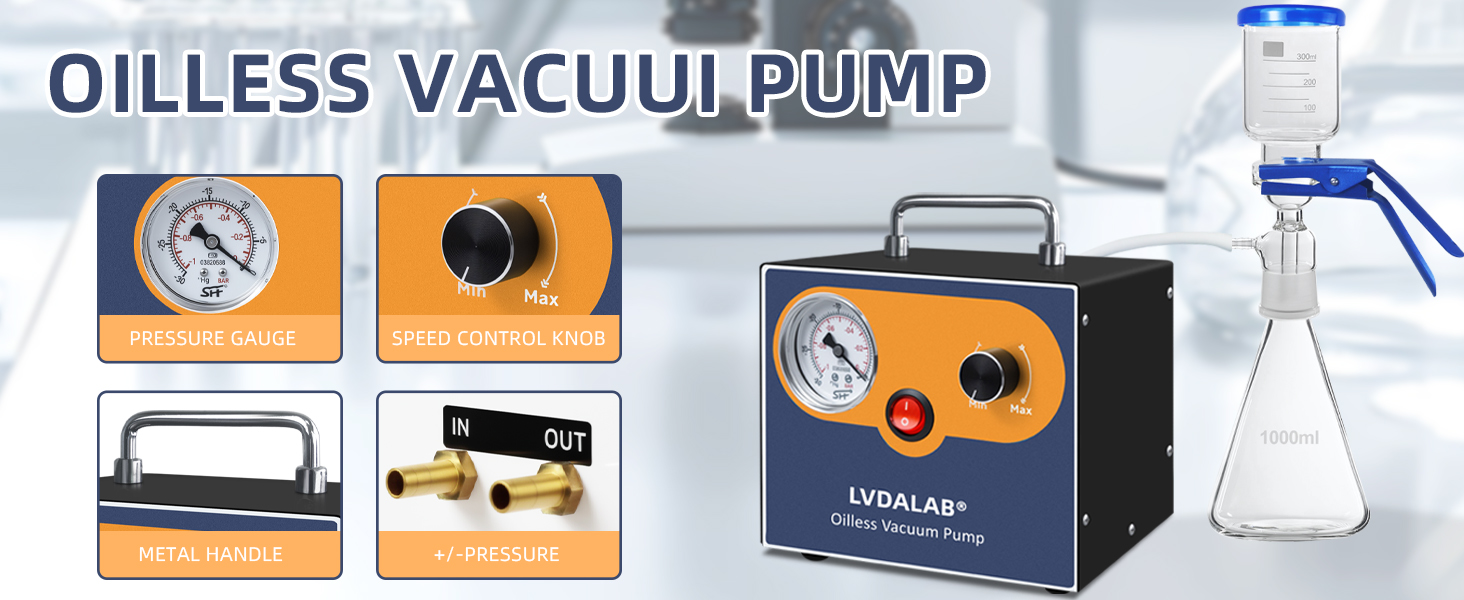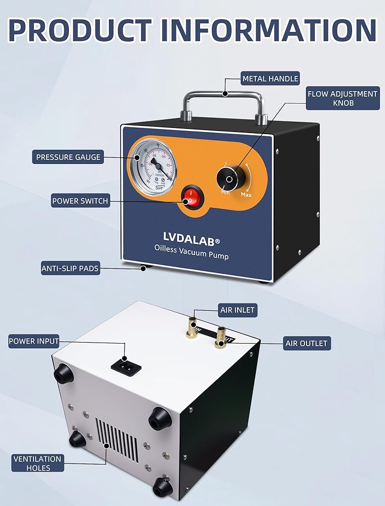 【OILLESS LAB VACUUM PUMP】---Engineered for a CLEAN, DRY VACUUM environment, preventing the need for oil changes, oil mist, and regular maintenance, which ensures a pure process for sensitive applications like lab work and electronics.This oil-free vacuum pump can operate continuously from atmospheric pressure to its maximum vacuum rating without risk of oil carryover or overheating.