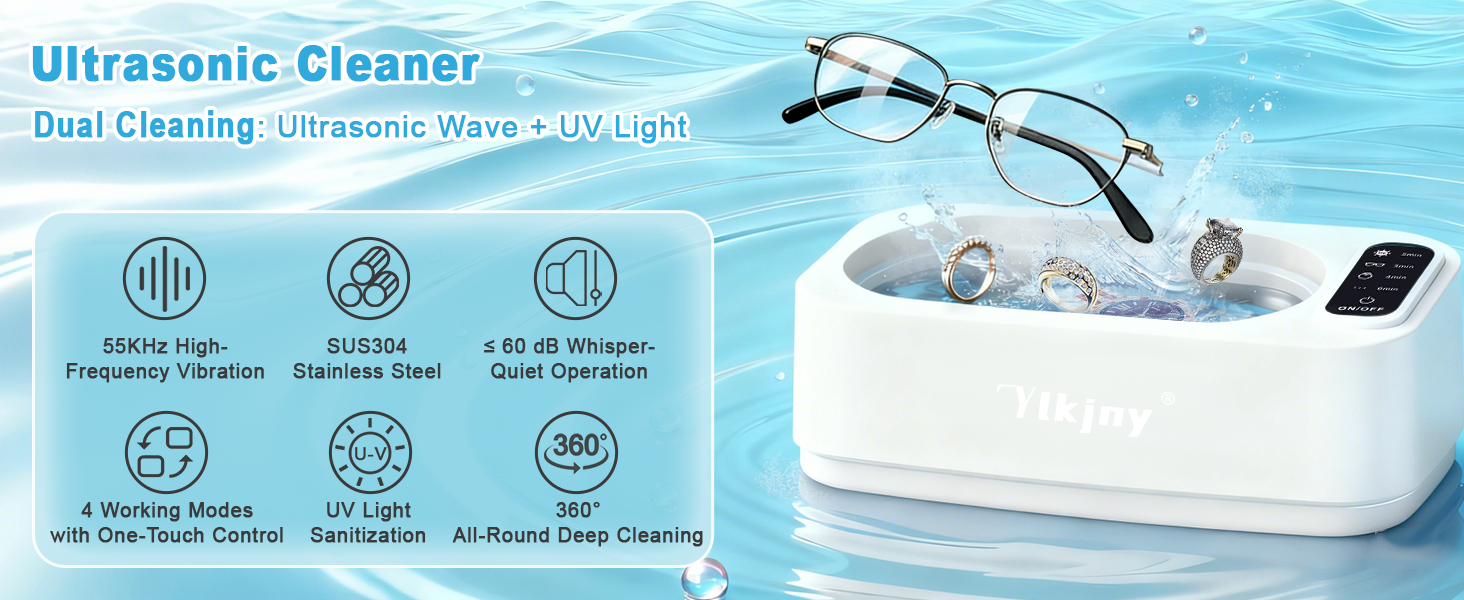 【55KHz high-frequency deep cleaning】Unlike standard 42kHz or 48kHz,our ultrasonic jewelry cleaner generates 55,000Hz sound waves. This high frequency creates finer, denser cavitation bubbles that penetrate blind holes, cracks, and recesses to remove hidden dirt, grime, and grease 360° without damaging your valuables. Perfect for restoring the sparkle to diamond rings, silver necklaces, and intricate watch bands