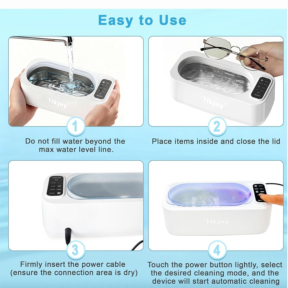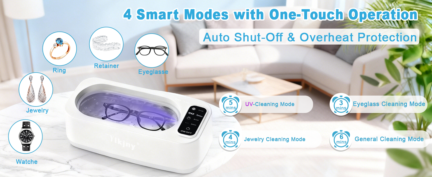 【4 Professional cleaning modes】This ultrasonic cleaner combines dual ultrasonic and LED cleaning technologies, and features four smart programs. 3-minute mode: Perfect for glasses cleaner and light cleaning tasks; 4-minute mode: Ideal for jewelry cleaner and ornaments; 6-minute mode: Designed for items requiring deep cleaning; 5-minute mode: LED-only cleaning without ultrasonic function, meeting all your diverse cleaning needs