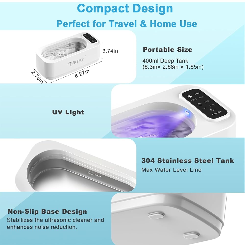 【Versatile cleaner for daily essentials】This ring cleaner ultrasonic machine is not just for jewelry. It is an ideal solution for cleaning eyeglasses, waterproof watches, dentures, retainers, aligners, coins, makeup brushes, and razor heads. The compact size (8.27 x 3.74 x 2.76 inches) and lightweight design (0.72 lbs) make it easy to store or carry during travel
