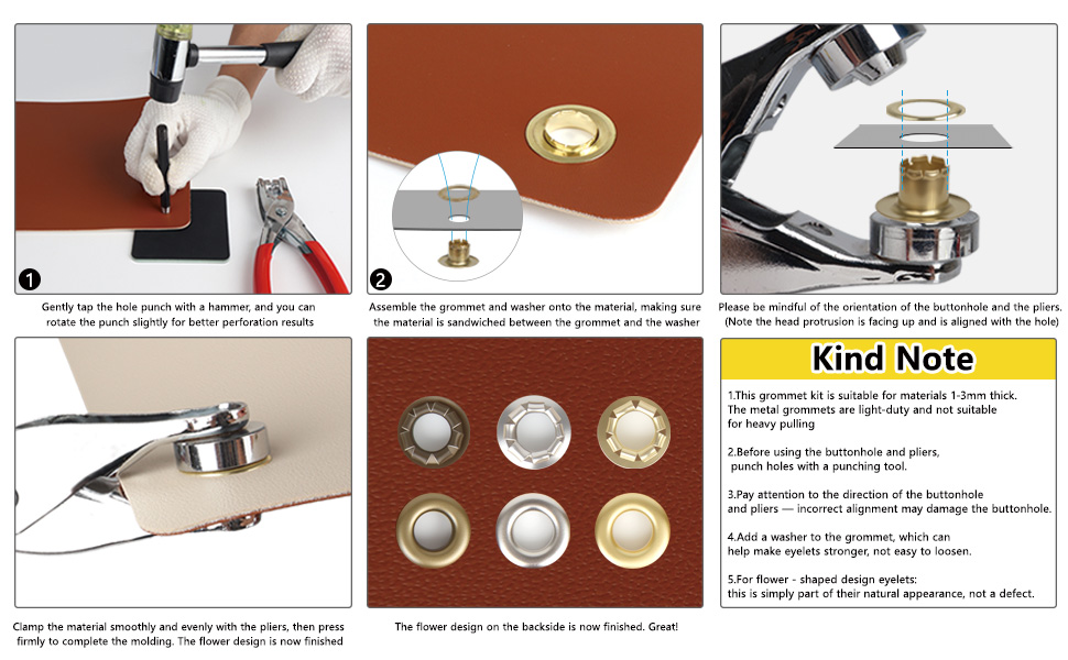 Secure Fastening with Washers: Each eyelet is used with a matching metal washer to create a strong, durable hold that resists loosening. The flared ("flowering") bottom design is intentional for a secure finish.