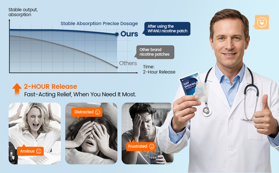 [Product Advantages]:Traditional 24-hour continuous release can easily cause nighttime stimulation and prolonged dependence. Our innovative controlled-release technology mimics daytime smoking patterns (initially one patch every 1-2 hours), specifically alleviating cravings only during waking hours, allowing the body to rest naturally at night. Through a three-stage scientific reduction (4 weeks intensive → 3 weeks sustained-release → 3 weeks low-frequency), it precisely suppresses withdrawal symptoms while avoiding sleep disturbance, helping the body and mind gradually adapt to a nicotine-free state, achieving a gentle yet thorough cessation.