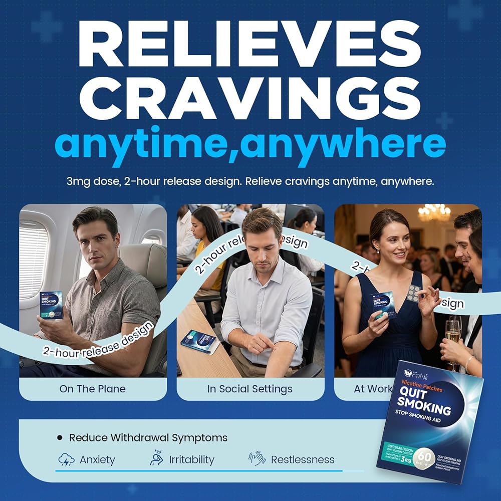 [Nicotine Patches]: Each patch contains a precise 3mg of nicotine, specifically designed for the gradual reduction phase. The transdermal sustained-release technology continuously alleviates typical withdrawal symptoms during smoking cessation, such as nicotine cravings, irritability, anxiety, and difficulty concentrating, providing a smooth transition support.