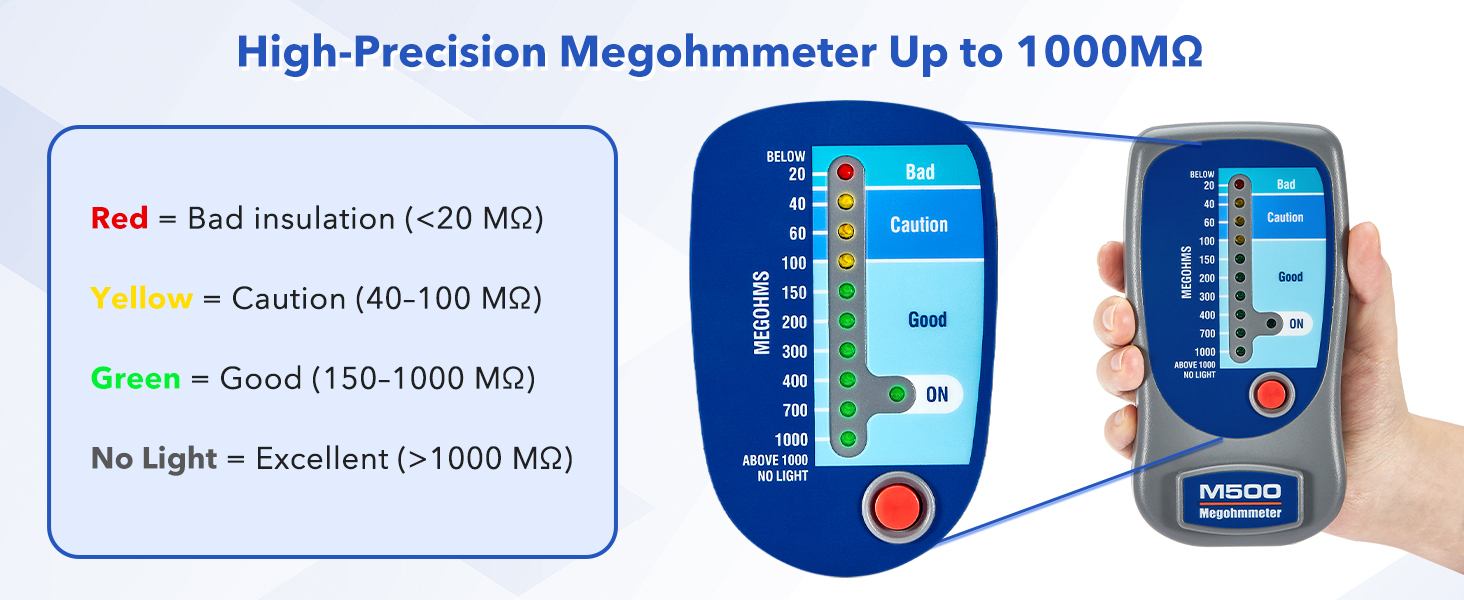Clear Visual Rating System for Quick Assessment: Features an intuitive built-in resistance scale that clearly indicates insulation status as Red = Bad insulation (<20 MΩ), Yellow = Caution (40–100 MΩ), Green = Good (150–1000 MΩ), No Light = Excellent (>1000 MΩ). This allows for fast, informed decisions without complex interpretation