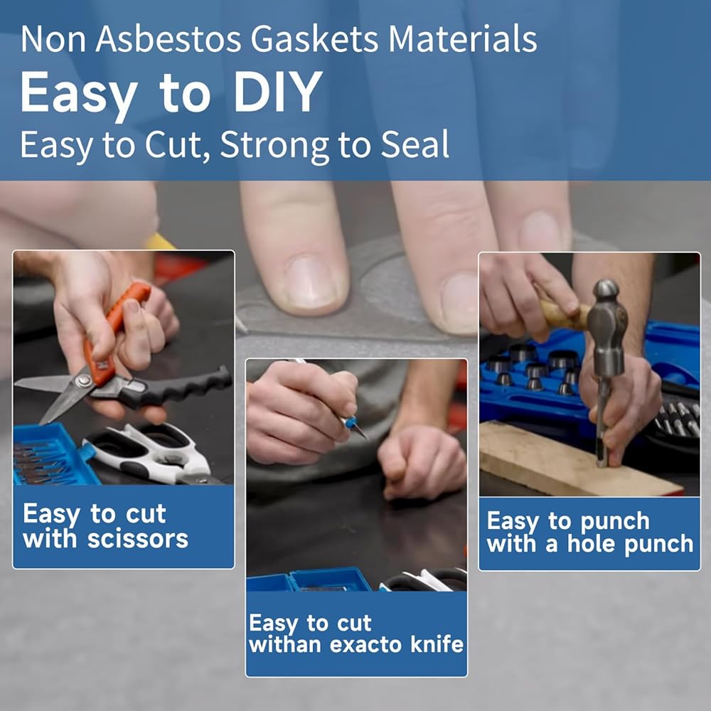 Simple DIY operation, mark the required part shapes on non-asbestos gasket material with a pencil, and easily cut to the desired shape and size using scissors or tools. Suitable for DIY modification of gasoline and diesel gaskets.