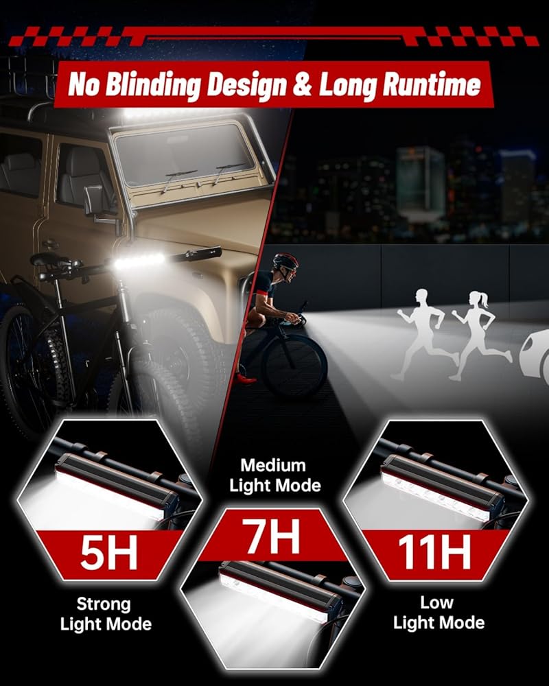 Stable installation bracket: How many times have your bicycle lights slipped or loosened when you were riding in a pothole? The feature of this bicycle lamp is that the double nuts and silicone bearings are built into an aluminum bracket, so you can safely fix the lamp on the handlebars without frequently adjusting the height.
