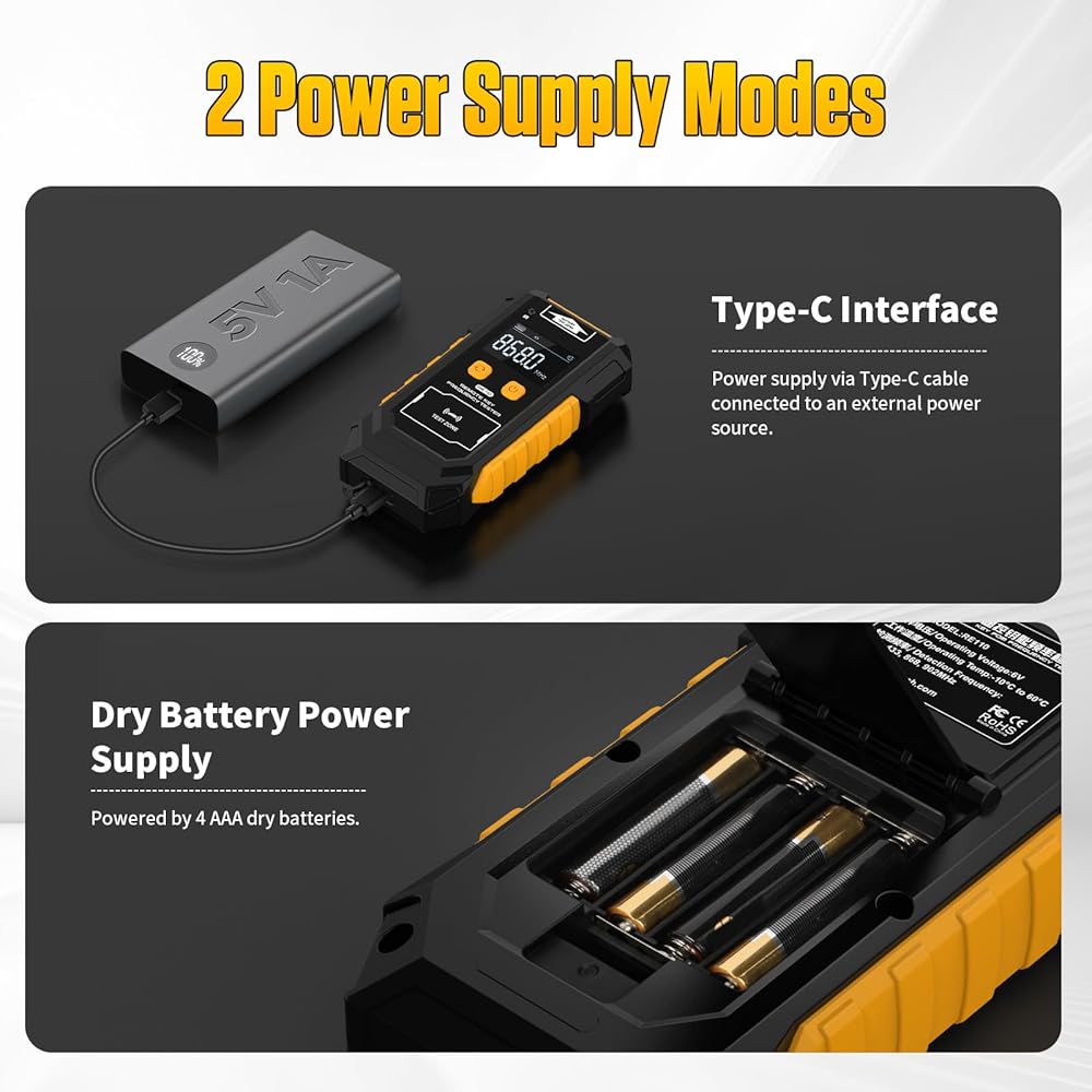 【Dual Power Supply & Long Battery Life】 Powered by 4 AAA batteries for wireless portability, meeting the needs of quick on-site detection and maintenance outdoors. It can also be powered by a Type-C data cable connected to a power bank for continuous battery life, adapting to long-time diagnosis requirements.