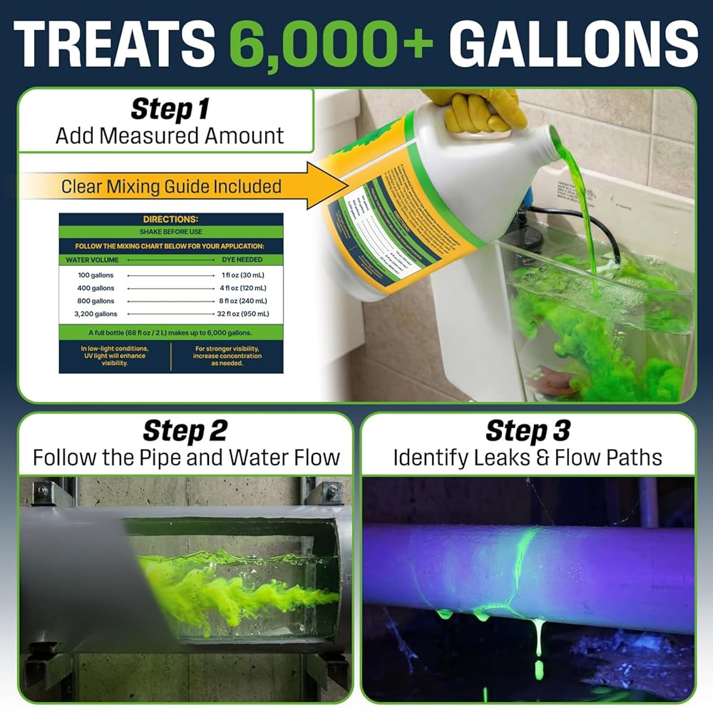 Concentrated Green Water Tracing Dye for Leak Detection – Treats 6,000+ Gallons – Non-Staining UV Dye for Toilets, Pools, Plumbing, Septic, Storm Drains – 68 oz