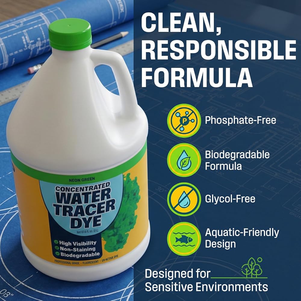 • Safe to Use Anywhere – This biodegradable leak detection dye is formulated without phosphates, glycol, or harsh pollutants—making it safe for leak detection and water flow studies. Whether you're working in plumbing, stormwater systems, or decorative fun, it's formulated for results without the mess or worry.