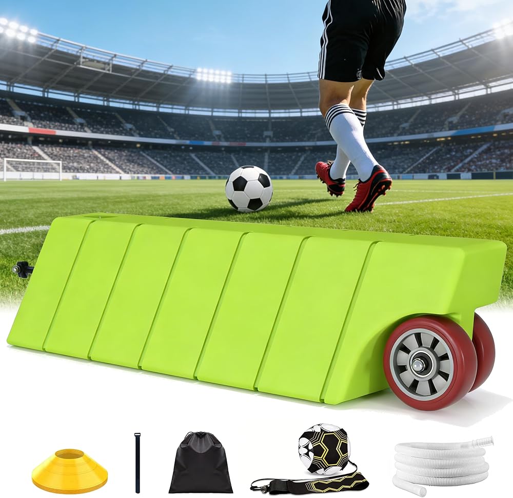 COMPLETE TRAINING KIT: Includes a water hose for easy filling, 6 agility cones, a dribble band, a strap for connecting the rebounder to the ball, and a storage bag—everything you need for a full soccer training setup. Maximum value, one complete package.