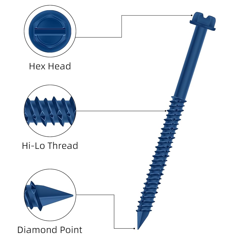 MATERIAL: Concrete screws are made of high quality carbon steel, classics high temperature quenching, hardness is high. The surface of the screw is treated with blue ruspert, which has strong corrosion resistance.
