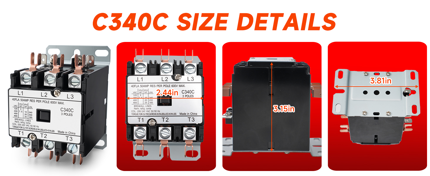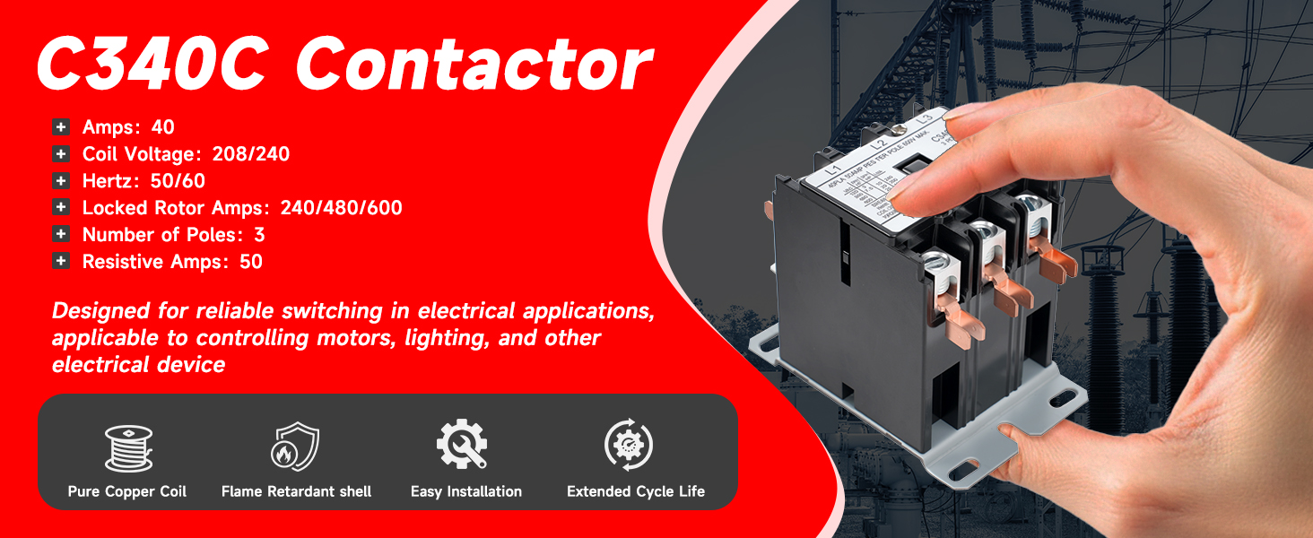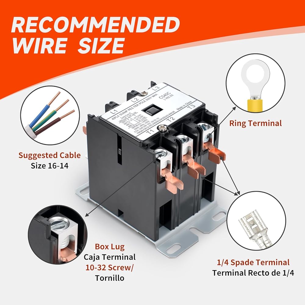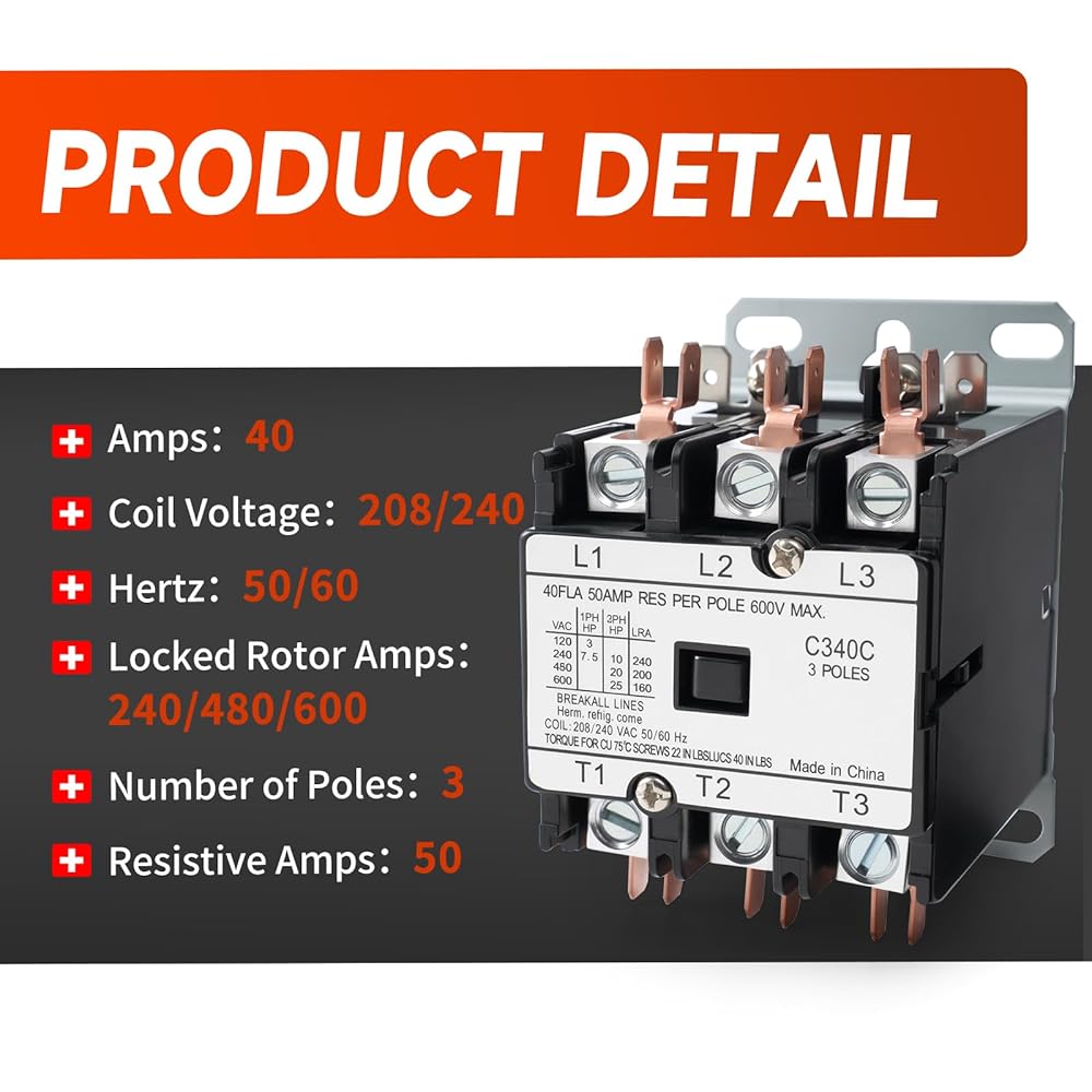 Superior Quality: C340C 3 Pole 40 Amp 208/240V Contactor built for durability with flame-retardant housing, high-quality silver alloy contacts (resistant to oxidation), a full-turn purple copper coil, and all-copper terminals for better conductivity