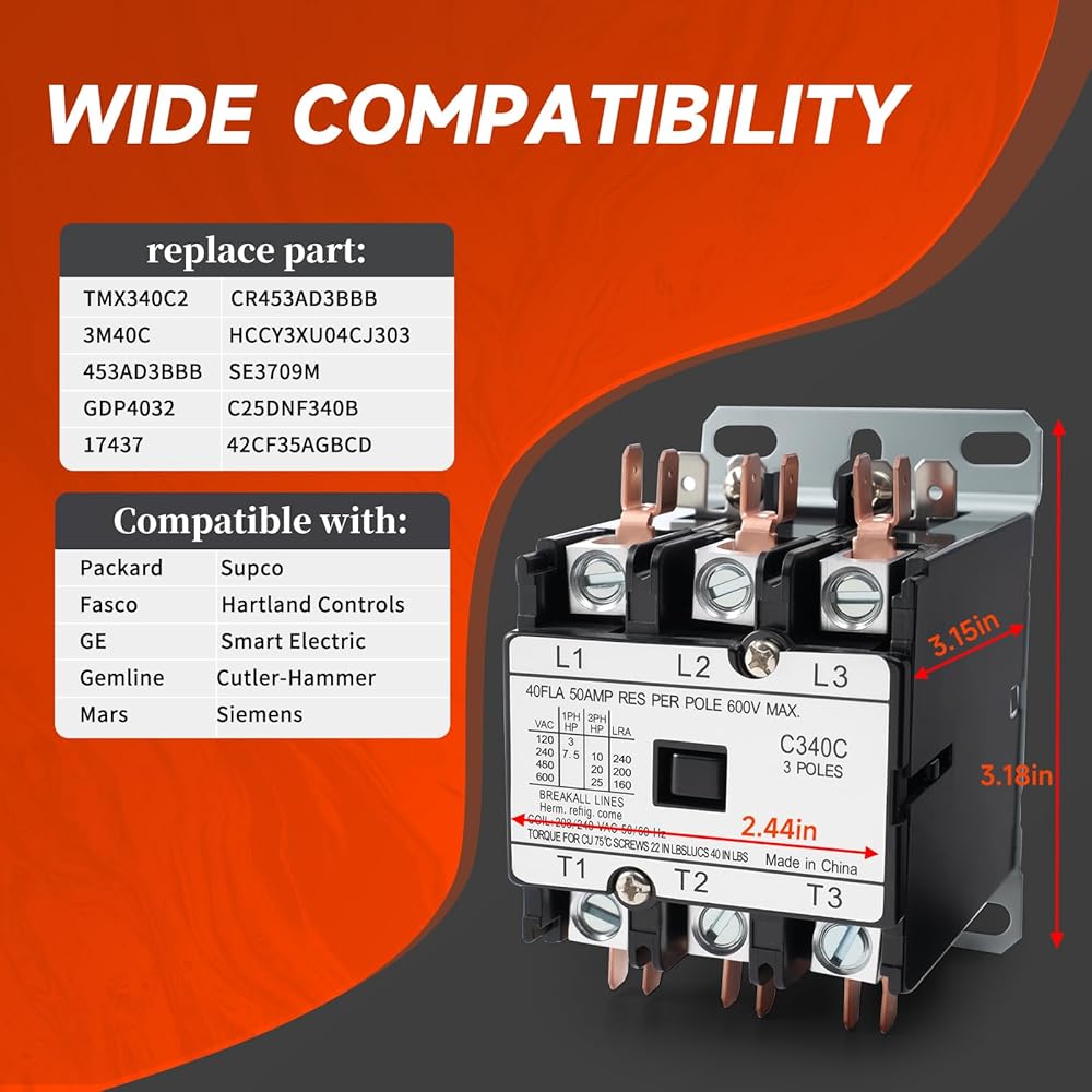 Wide Application: C340C contactor compatible with Packard Fasco GE Gemline Mars Supco Hartland Controls Smart Electric Cutler-Hammer Siemens contactor, C340C 3 Pole 40 Amp 208/240V Contactor designed for reliable switching in electrical applications, applicable to controlling motors, lighting, and other electrical devices