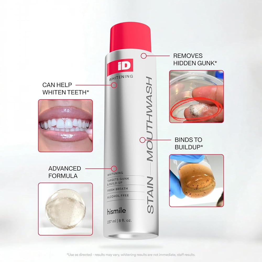 Freshen Breath and Rinse Away Gunk: Brushing and flossing can be known to only reach 25% of the surfaces in your mouth, iD Stain Whitening Mouthwash picks up where your toothbrush leaves off targeting the soft tissue areas like your tongue, cheeks, and gumline for a cleaner feeling mouth.