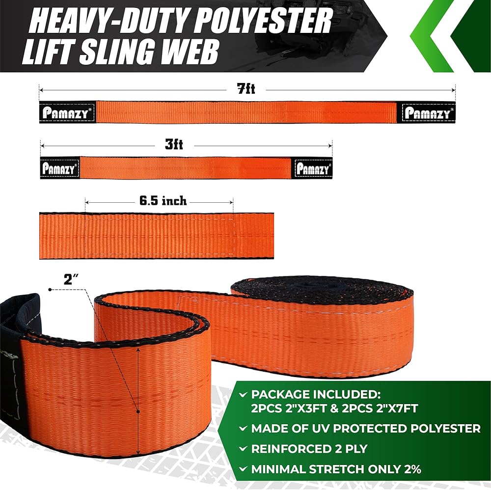 🌟SUITABLE FOR VARIOUS WORKING ENVIRONMENT: Our set includes 2PCS 2”x3FT & 2PCS 2”x7FT lift sling straps with UV and weather-resistant. Built for the most demanding towing and recovery tasks. The different sizes will help you choose the suitable type with your attachment. Recover your vehicles that are in tough situations such as snow, water, mud or sand. It can also be used for felling trees and extracting stumps.