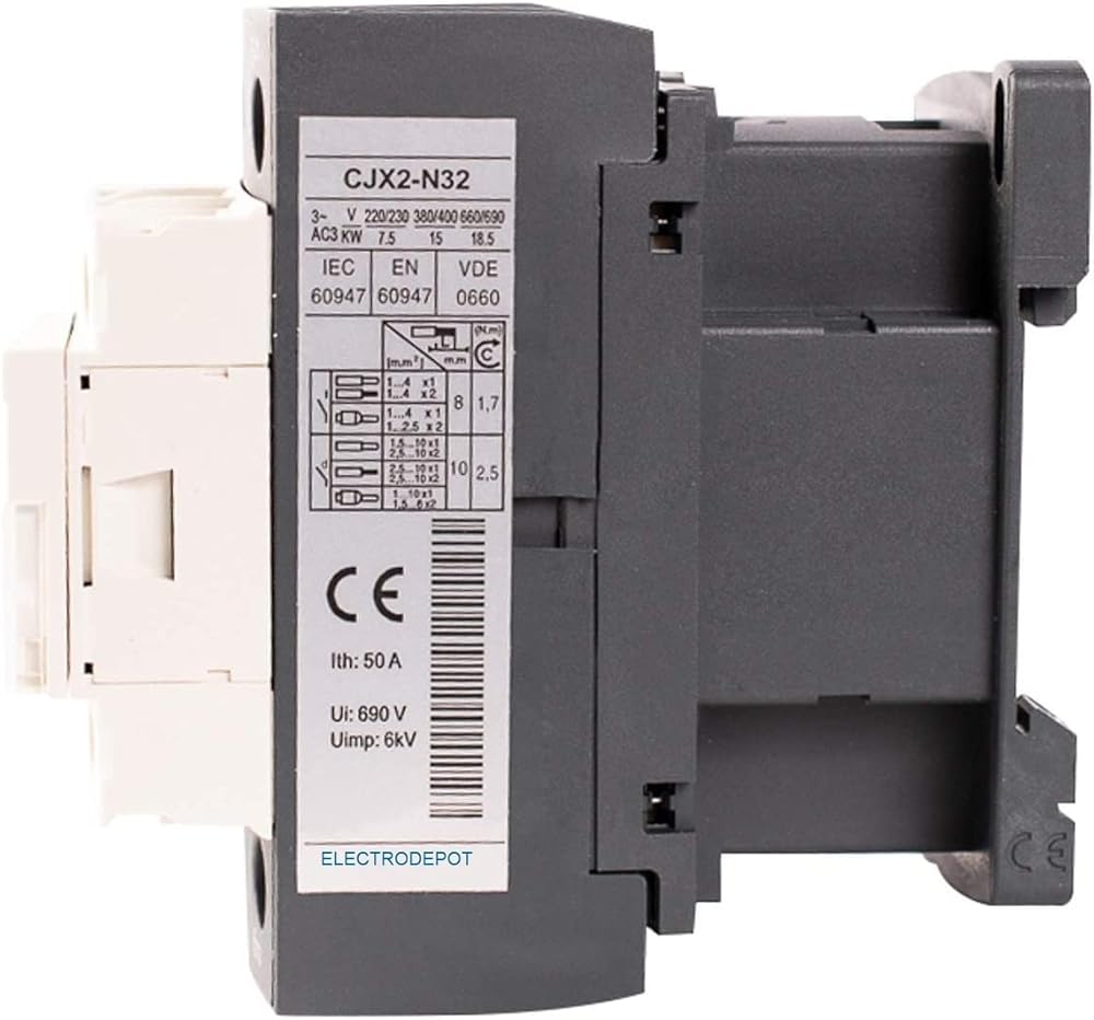 50A Contactor 3 Pole 120V coil, 600V, Motor load 32A, Lighting 40A, 50A NO NC DIN mount. 50 Amp. AC-1, 32 Amp. AC-3 Normally Open (N.O.) contacts 50 A. Incandescent, LED or resistive load 32 A. Motor control, 20HP@ 480VAC Auxiliary contact 1NO/1NC