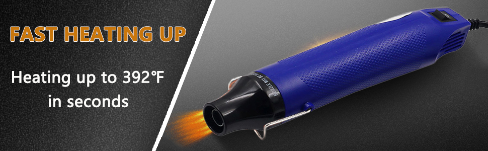 The air outlet of the heat shrink gun is made of stainless steel, which Will not be damaged by high temperature. The outer shell is made of ABS plastic, and has a convex anti-slip design, light and small in size, and comfortable to hold. Designed with a metal bracket, it can be easily placed on the table without causing any objects to come into contact with the high-temperature air outlet.
