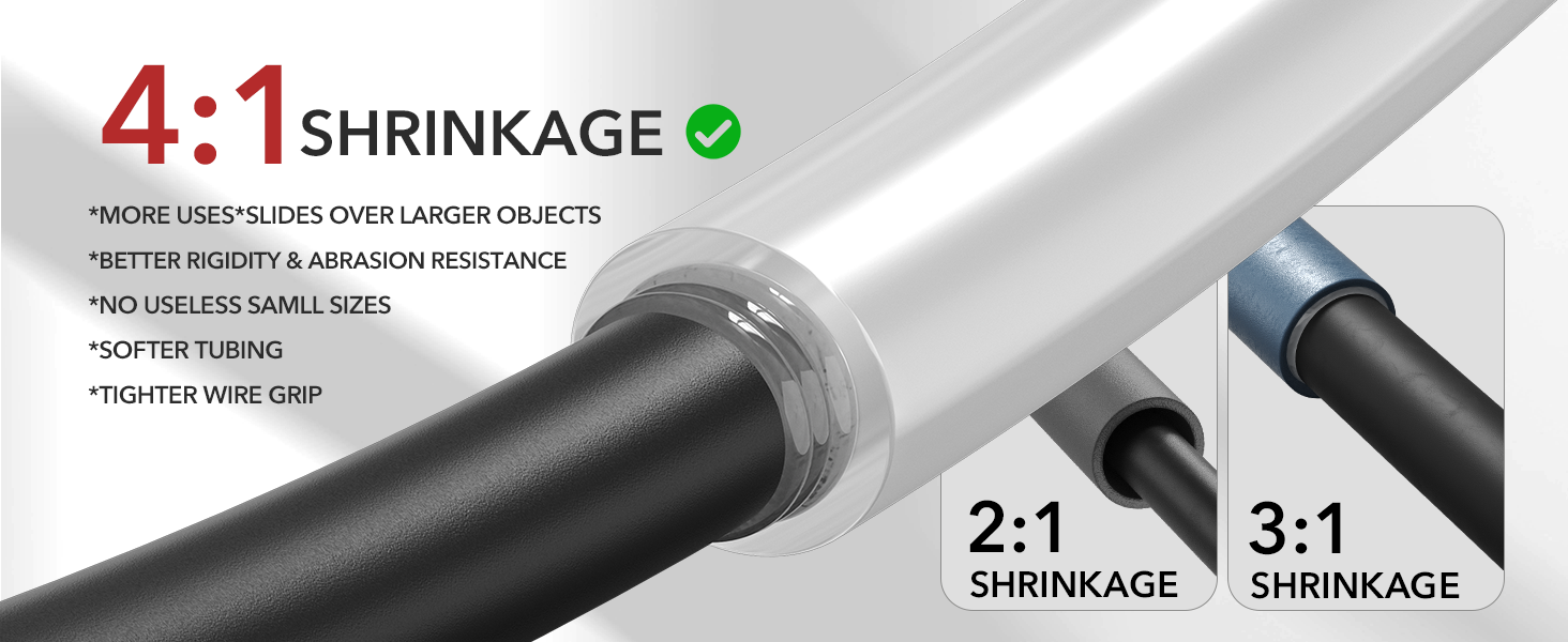 4:1 High-Ratio Shrinkage And Rapid Shrink Speed: Heat shrink tubing Shrinks to 1/4 of original diameter for enhanced sealing and 35% improved performance. This resolves the insufficient shrinkage issues common in standard 2:1 or 3:1 heat shrink. Heat shrink temperature: 80 to 125°C, achieving professional connections within seconds and resolve question caused by insufficient shrinkage in traditional shrink tubing.