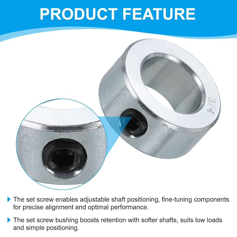 Advantage: The carbon steel shaft collar, strong and tough, resists deformation/breakage under heavy loads for stable performance. Its zinc-plated surface resists corrosion in humid environments, and it reduces noise during high-speed operation. The set screw design allows adjustable shaft positioning for precise alignment, enhancing holding power with softer shafts—suitable for low axial loads and simple positioning.