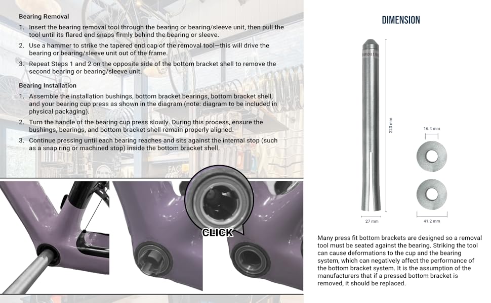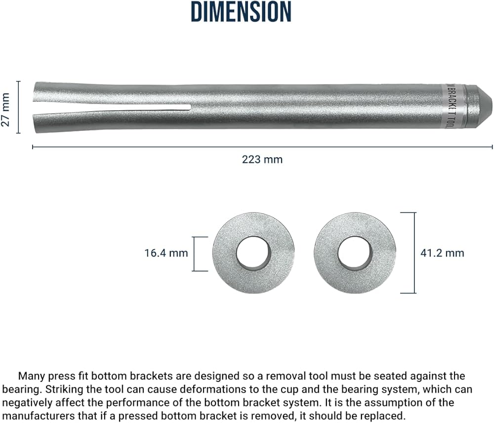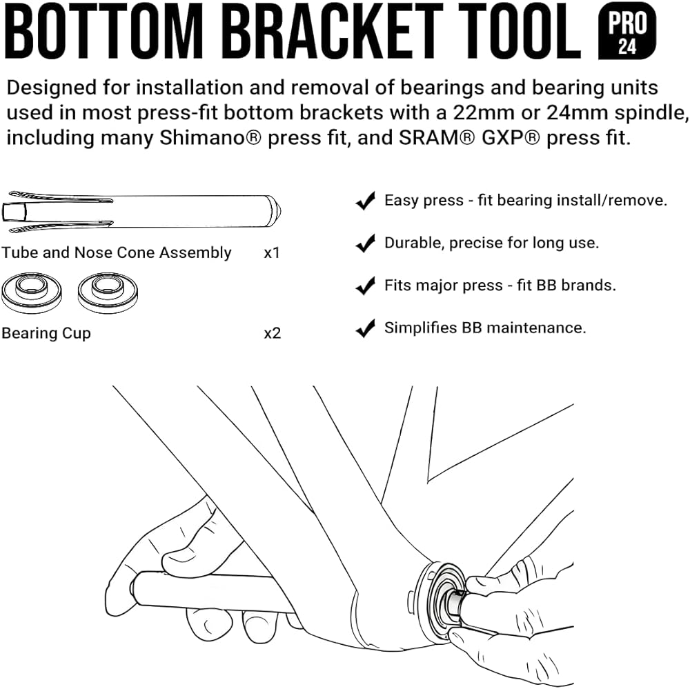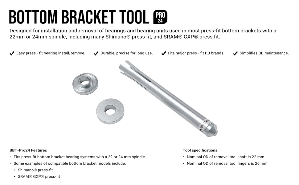 【Effortlessly Remove & Install Press Fit Bottom Bracket Bearings】Designed for BB90, BB92, Shimano Press Fit, SRAM GXP, and Race Face systems, this press fit removal tool makes servicing internal bottom bracket bearings fast and reliable. Perfect for 22mm–24mm ID bearings, it ensures a secure grip during extraction, reducing slippage and frame damage. A must-have for bike mechanics and DIY enthusiasts.