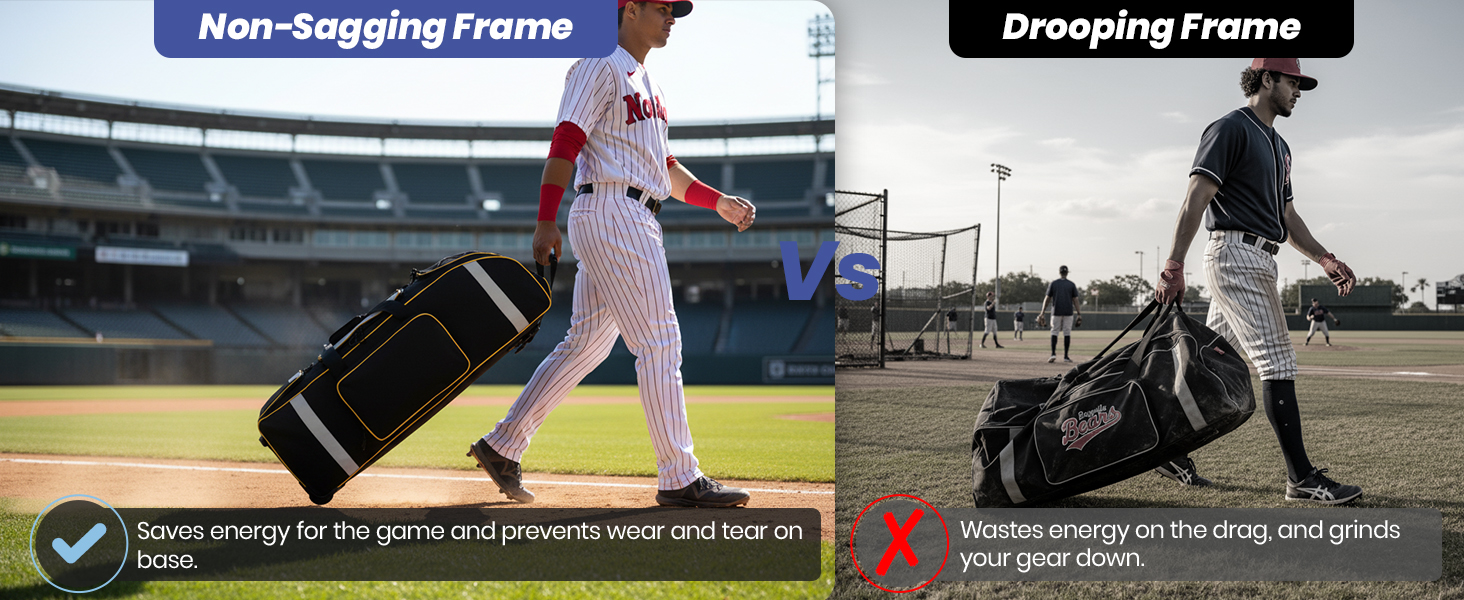 [Fence Hooks & Stays Upright]: Exclusive double-track fence hooks let you hang catcher's gear bag securely on the fence for easy, no-bend access. The internal sturdy frame keeps the bag upright on any surface. Anti-slip bottom prevents mud tipping. Converts between hand-carry and rolling modes in seconds – ideal for tight spaces like locker rooms or stairs.