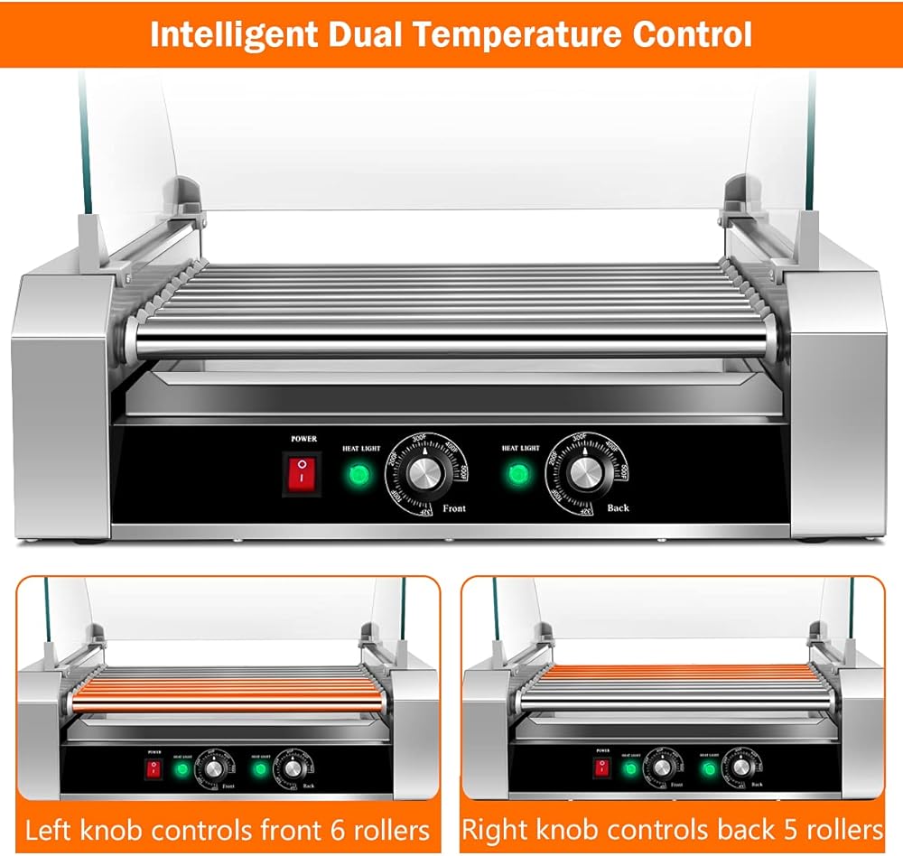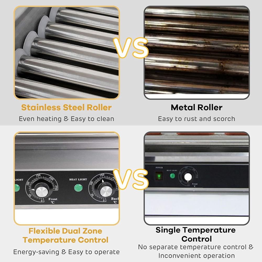 🌭【Dual-Temperature Dials & 360 Full Roller Rotation】This hot dog cooker allows separate temperature control for the front and back rollers, so you can cook on the back rollers, while the front rollers keep the items hot. Temperature control range: 32 - 500℉. Our hot dog maker features full 360-degree roller rotation system that provides a slow, consistent motion that cooks food evenly and keeps your guests coming back for more.