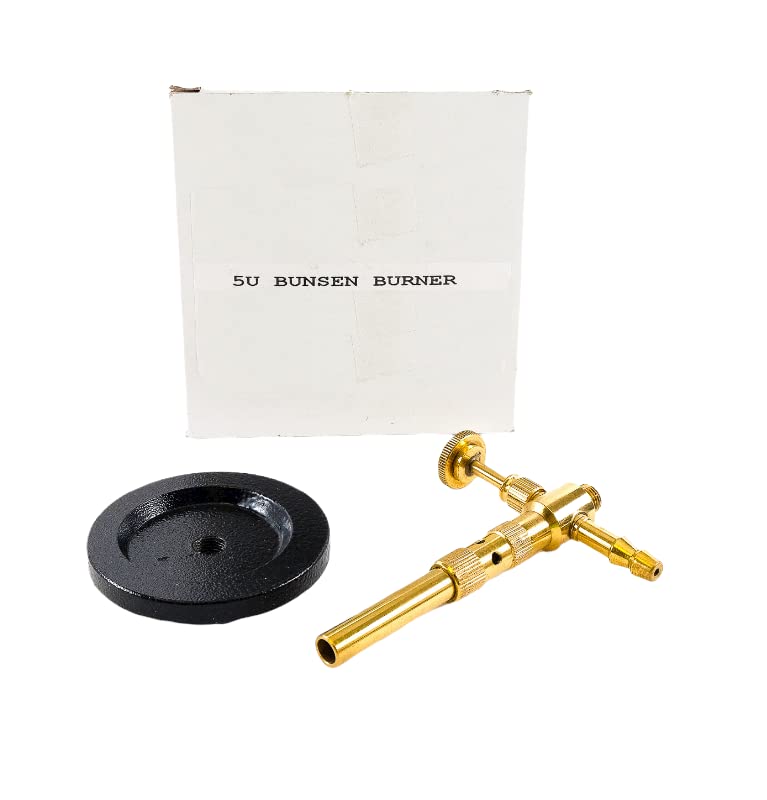 No. 5U Bunsen Burner. Designed for use with Natural Gas Only. Burner is 4 1/2" High, has a Solid Brass Burner with a Black Base, and adds a Flame Height Adjustment Knob