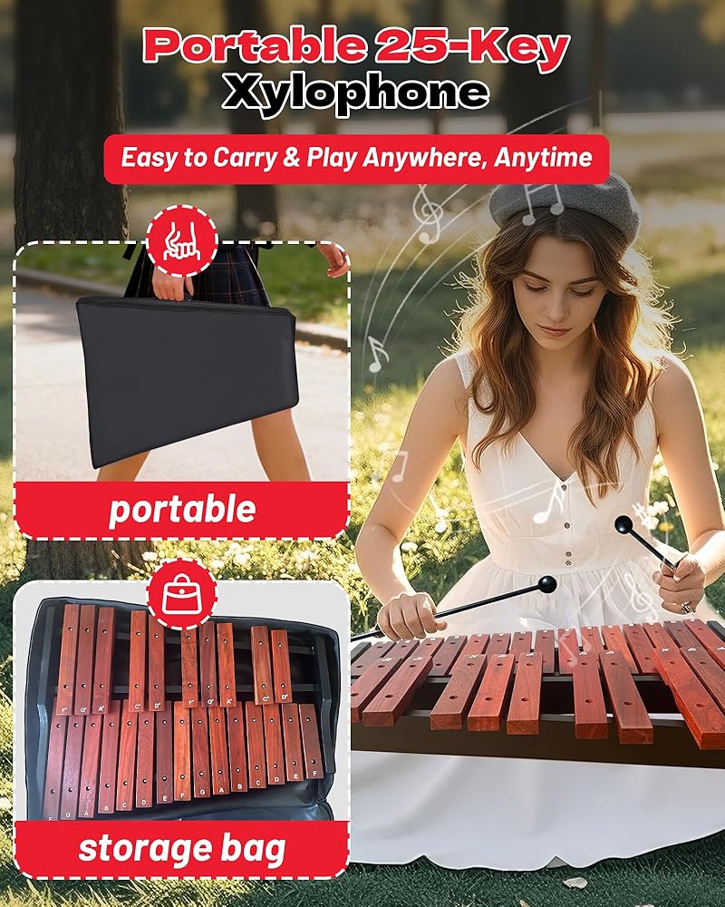 25-Note Portable Wooden Glockenspiel with & Xylophone Two Pairs of Mallets | Professional-Sounding Instrument for Beginners, Early Music Education, and Classroom Learning