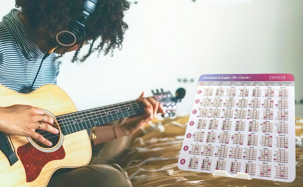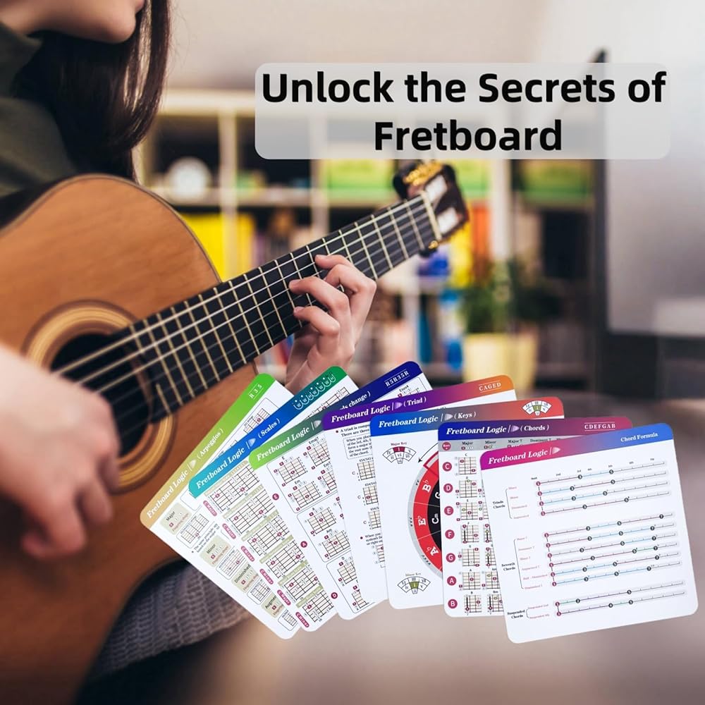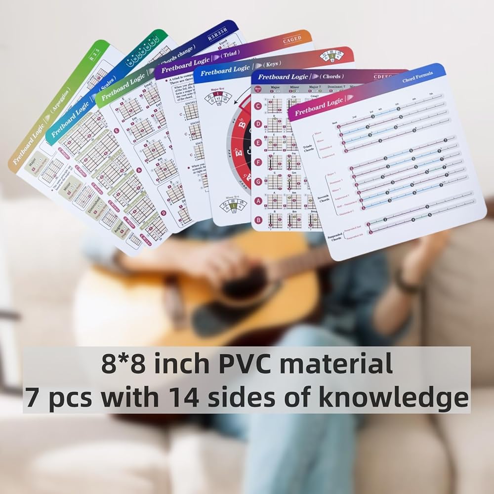 Comprehensive Theory Tool:The Guitar Fretboard Logic Set includes 7 double-sided (14 pages) 8x8-inch cards, comprehensively covering Chords, Scales, Keys, triad, Arpeggios, Chord Formulas, and Change Logic, providing beginners with an all-in-one theoretical foundation.