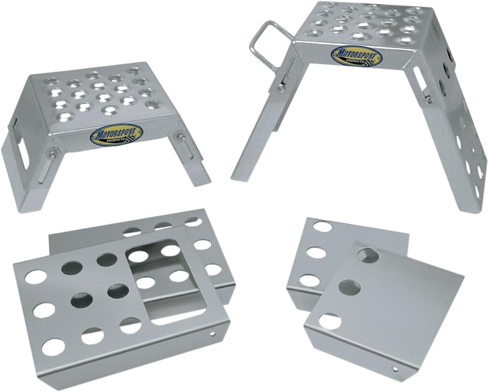 Step block risers for youth motocrossers at the starting gate. Blocks adjust from 3" tall thru 9" tall. Cheese grater surface works for cleaning mud off boot bottoms and helps prevent slipping. Blocks are stackable with a single carry handle. Made from high quality aircraft aluminum with a sliver anodized finish.