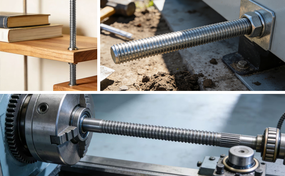 Wide Applications: These threaded rods provide reliable structural anchoring for light poles, traffic signals, and machinery assembly. They also serve as versatile fasteners for furniture, tools, clamps, hangers, and even as replacement carburetor bolts, fitting directly into nuts or tapped holes.