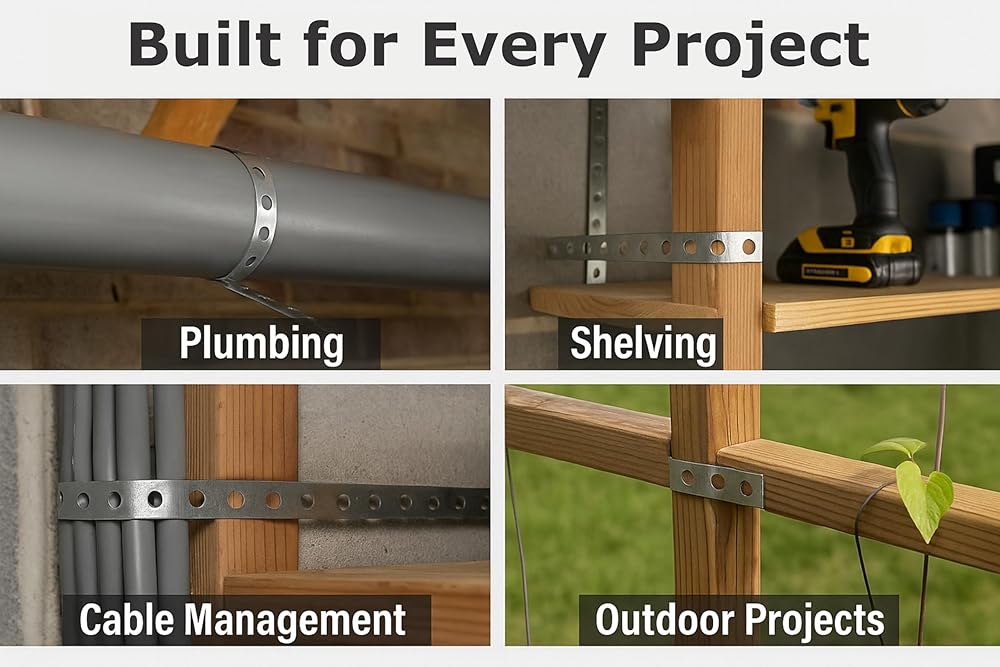 ULTIMATE VERSATILITY - Featuring a perforated design, this strapping adapts to any project—perfect for DIY, plumbing, HVAC, and construction, offering unmatched flexibility for all your mounting needs.Durable metal strapping with holes, perfect for pipe hanger strap and pipe strapping in DIY and construction.
