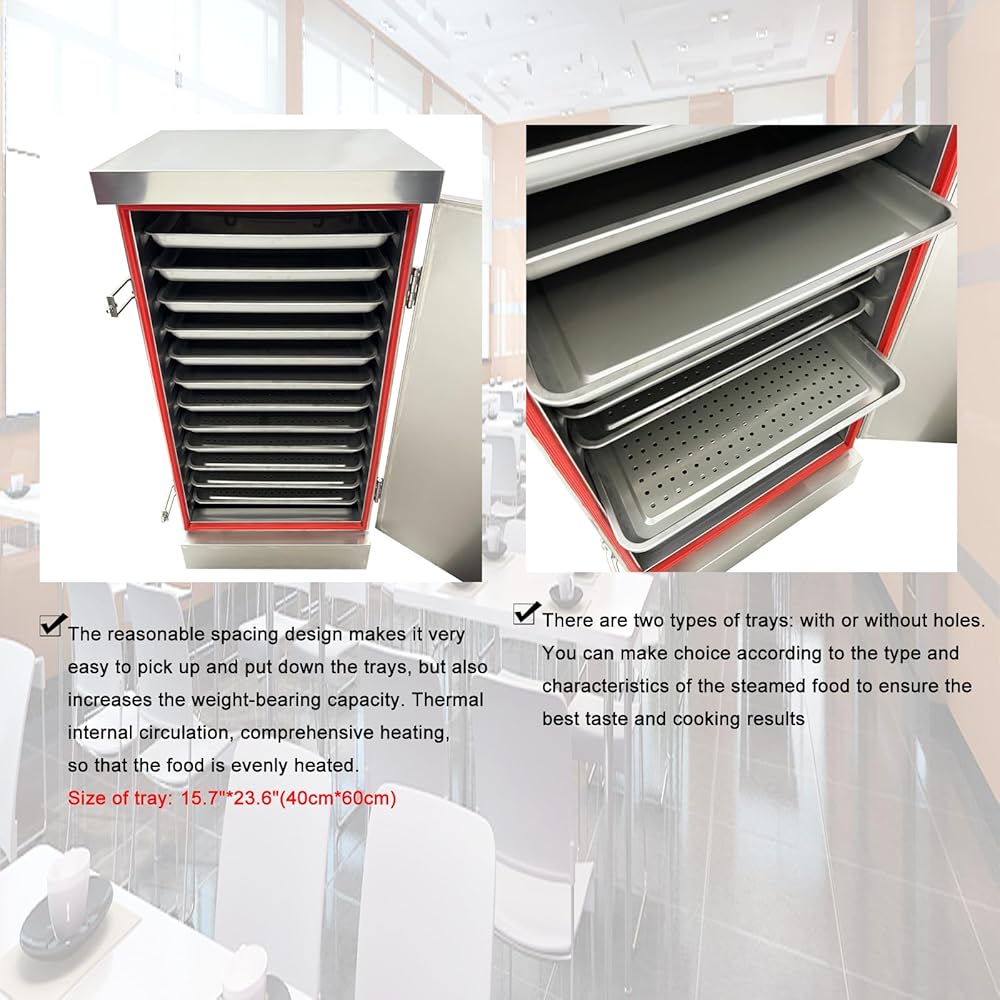 Reasonable Spacing Design: The spacing between trays is reasonable, which makes it very easy to pick up and put down the trays, but also increases the weight-bearing capacity. The food is evenly heated. Size of tray: 15.7"x23.6"(40cm x 60cm)
