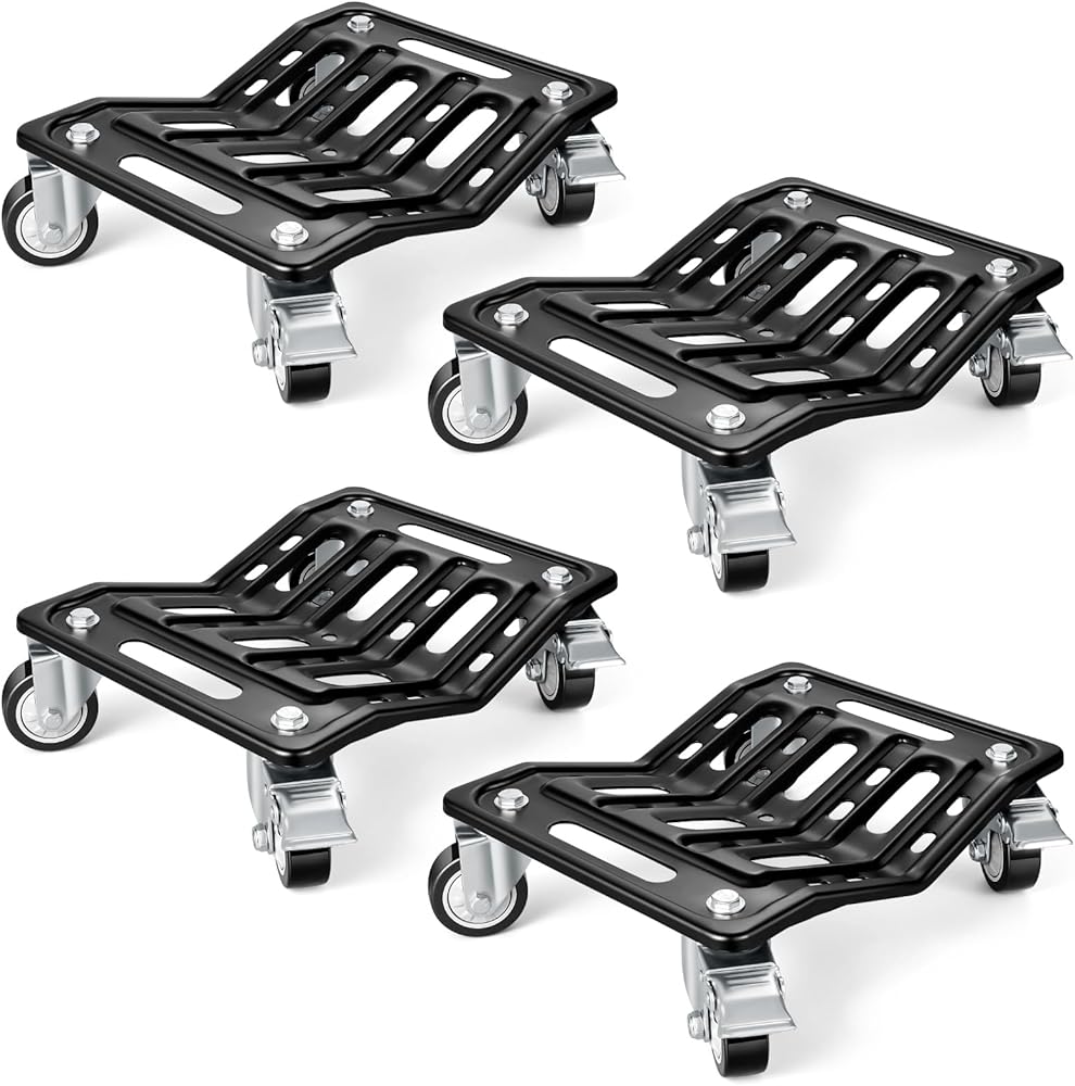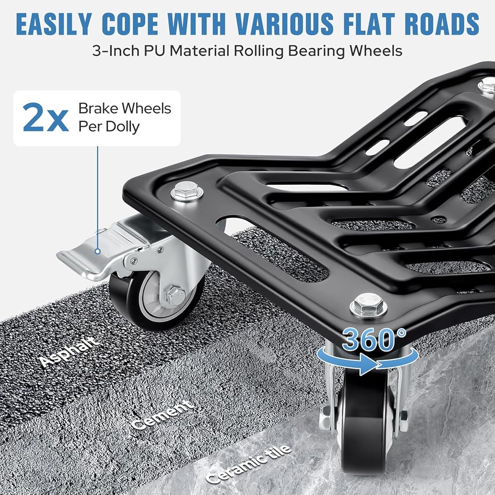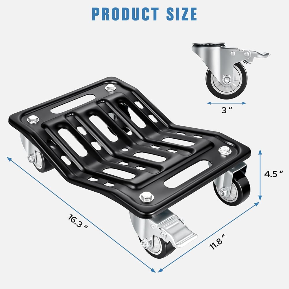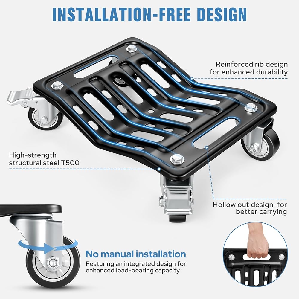 【No Assembly + Easy Portability】This 4-piece car dolly comes fully assembled—no need to install wheels or accessories. Ready to use right out of the box, it saves you time. Measuring 16.3"" x 11.8"" and weighing approximately 39 lbs(4 pieces). Car moving dolly features specifically designed hollow hand grips for easy lifting and storage in the car