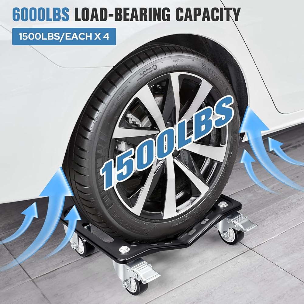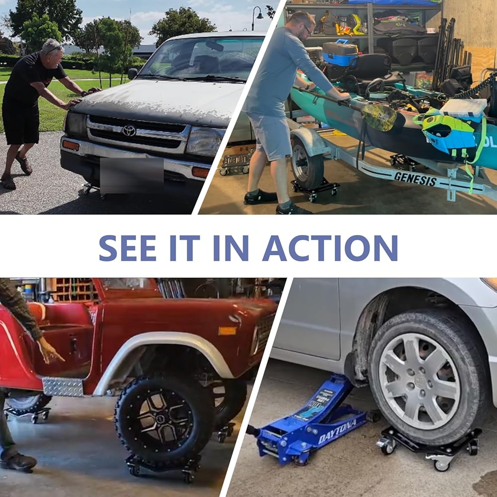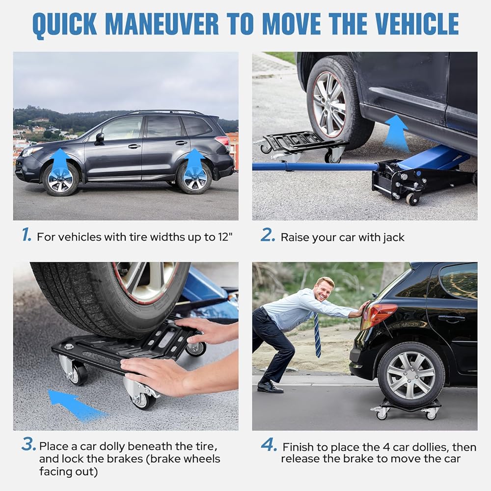 【Versatile Applications】 Ideal for sedans, sports cars, convertibles, pickup trucks, SUVs, and motorcycles. This car dolly set simplifies moving vehicles, changing tires, and performing various maintenance tasks with ease