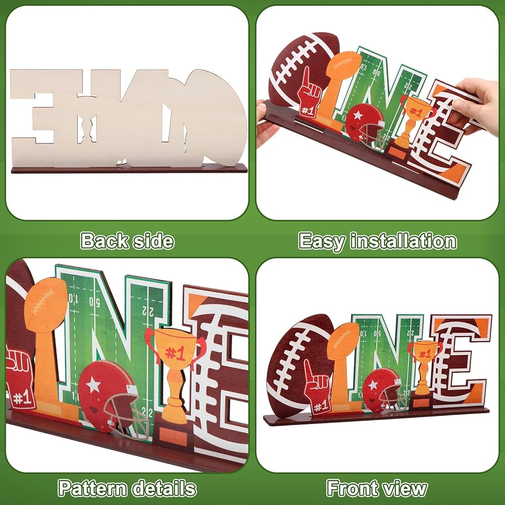 First Birthday Design: This first year down sign features the number "ONE" as its main design. The "O" is shaped like an American football, while the "N" and "E" incorporate elements of a football field and soccer ball. Other ingenious designs include a football, helmet, and trophy, combining first birthday party decorations with soccer. This is a beautifully crafted football 1st year down birthday decorations