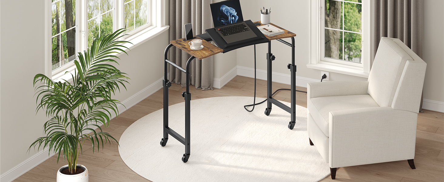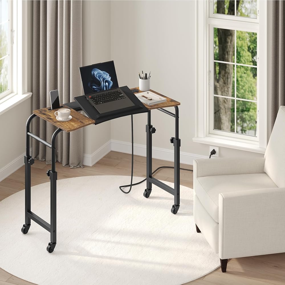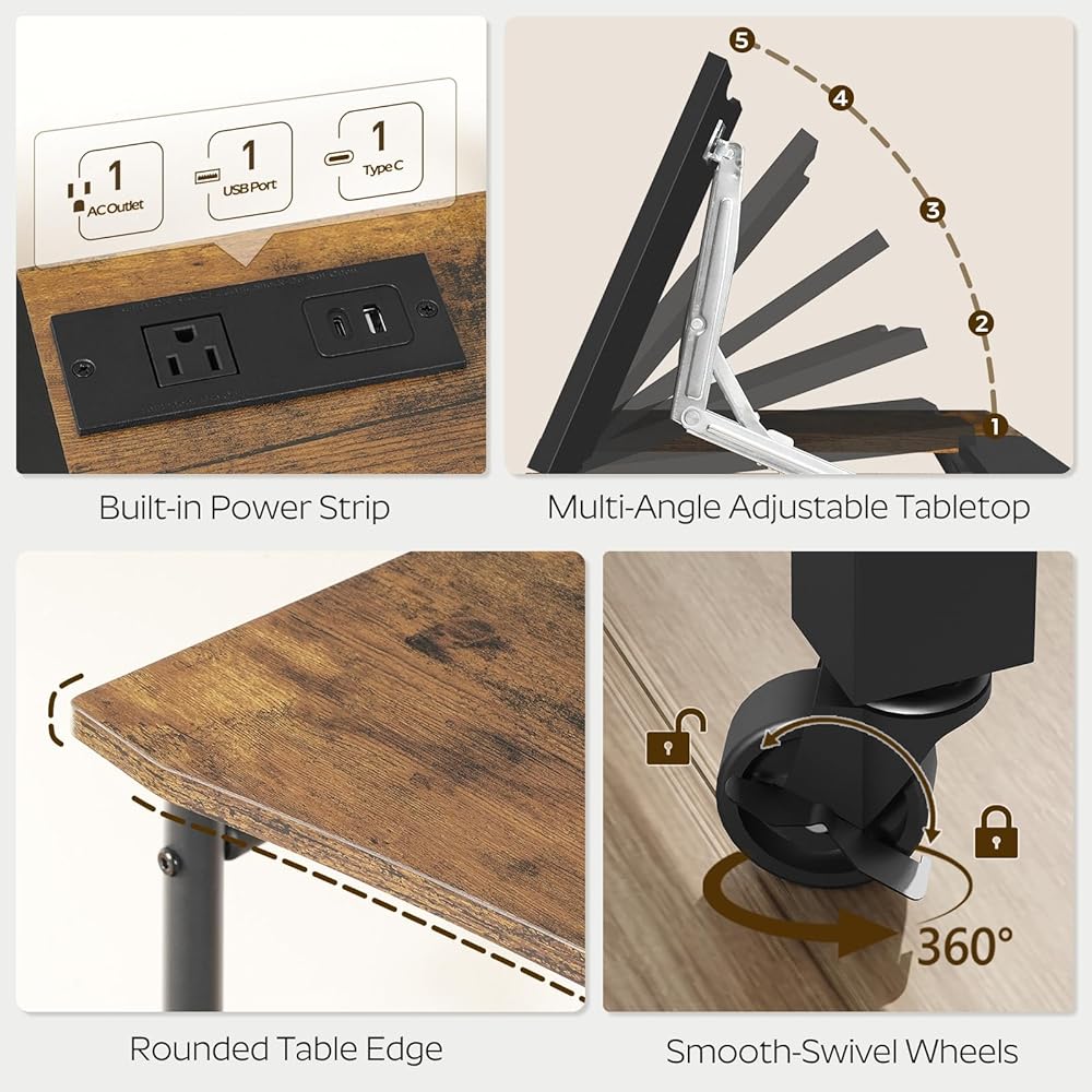 Overbed Table with Charging Station, Recliner Table with Wheels, Over the Bed Table Height Adjustable, Side Table for Bed, Sofa, Office, Rustic Brown and Black SF05UBR