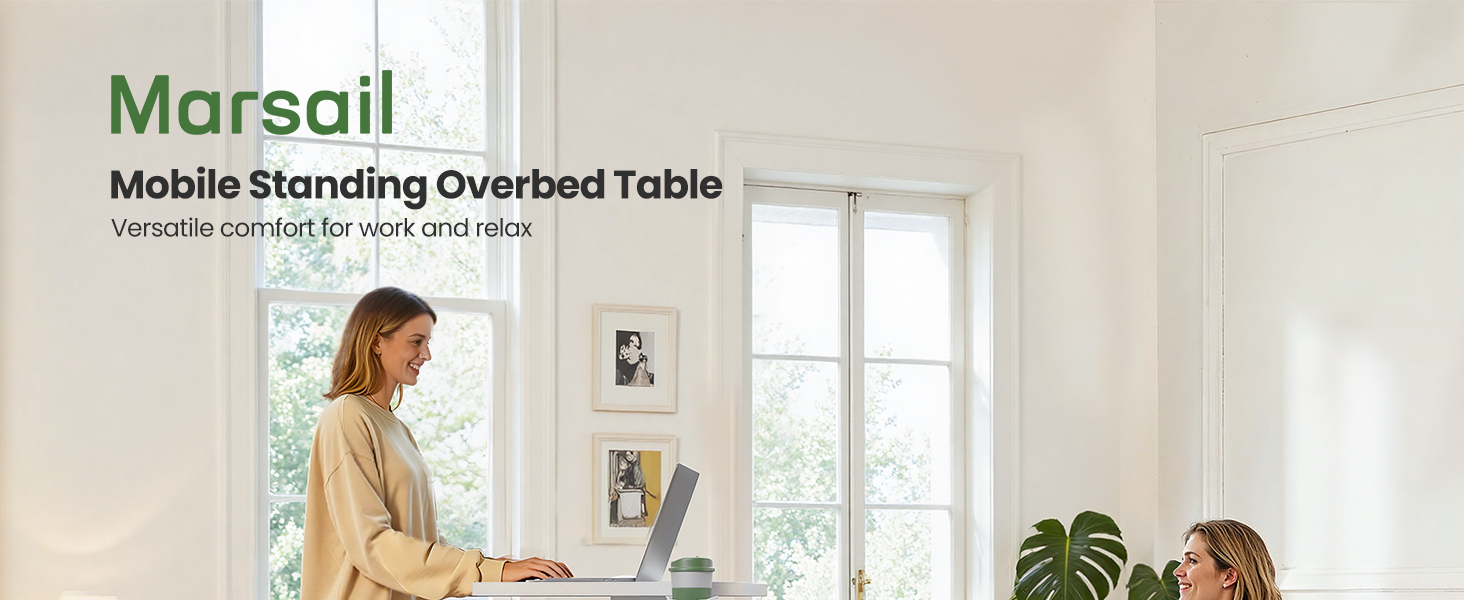 Sturdy, Waterproof and Safe: Crafted from cold-rolled steel, this pneumatic rolling standing desk—ideal as a bedroom bedside tray or rolling laptop cart—supports up to 22 lbs and has passed 20,000 lift cycles for long-lasting performance. This over the bed table has a waterproof surface that wipes clean easily, a scratch-resistant finish for lasting durability, and rounded edges for added security.