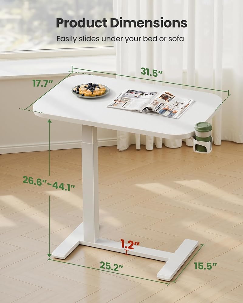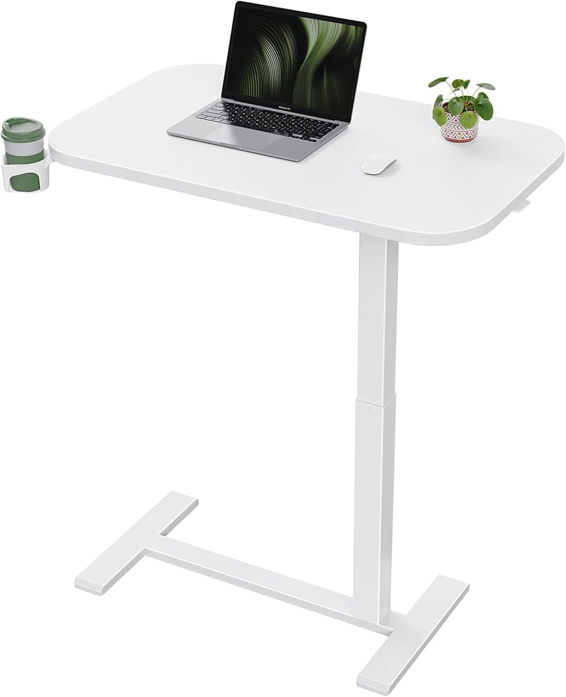 Marsail 28×16" Overbed Table with Wheels and 360° Cup Holder, Height-Adjustable Pneumatic Bedside Table, Mobile Computer Standing Desk for Home Office, White