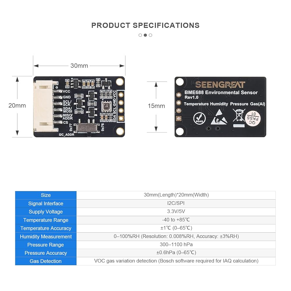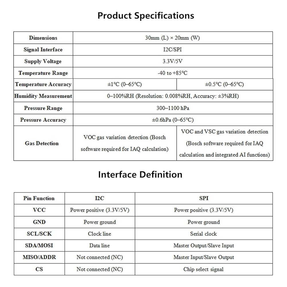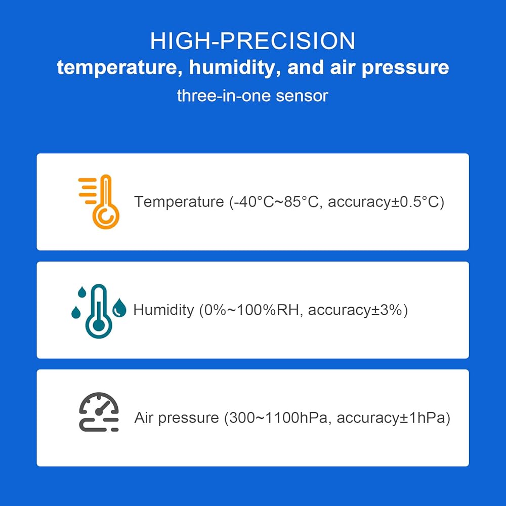 - 4-in-1 Environmental Monitoring: Measures temp(-40~85℃±0.5℃), humidity(0-100%RH±3%), pressure(300-1100hPa±0.6hPa) & VOC gas variation