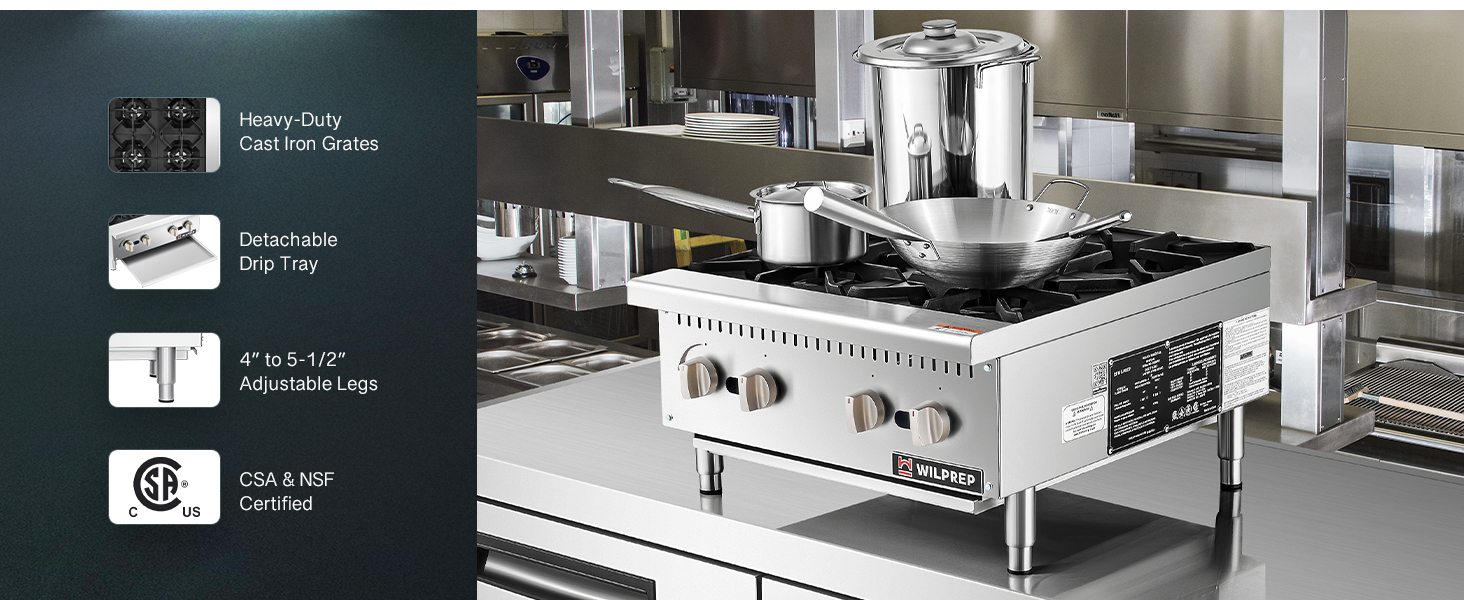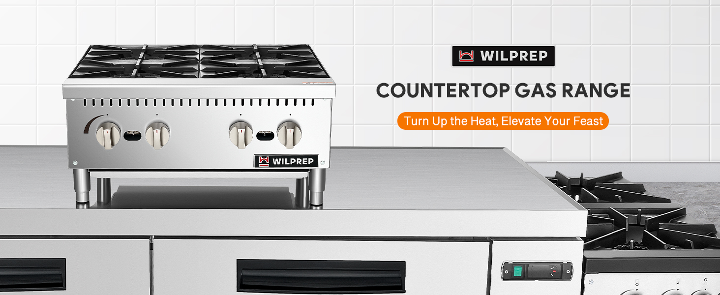 【Enhanced Culinary Performance】Boost your efficiency with Wilprep's countertop gas range, featuring 4 burners that deliver a total of 100,000 BTUs. Enjoy instant ignition with standing pilots, keeping your kitchen running smoothly even during peak hours