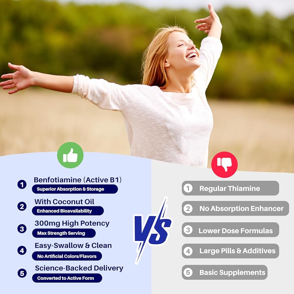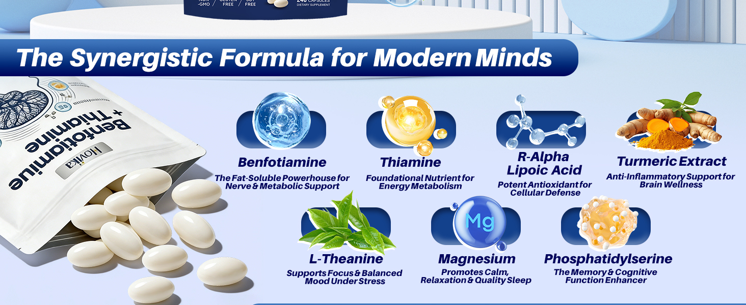 Synergistic Action of Bioavailable, Active Forms: The formula utilizes Benfotiamine, a fat-soluble form of Vitamin B1 with superior bioavailability compared to standard thiamine. It is paired with the active "R" form of Alpha-Lipoic Acid for enhanced efficacy. Key synergies include Phosphatidylserine for cognitive cell membrane support, L-Theanine for promoting relaxed alertness, and Turmeric with Magnesium for added antioxidant and relaxation benefits