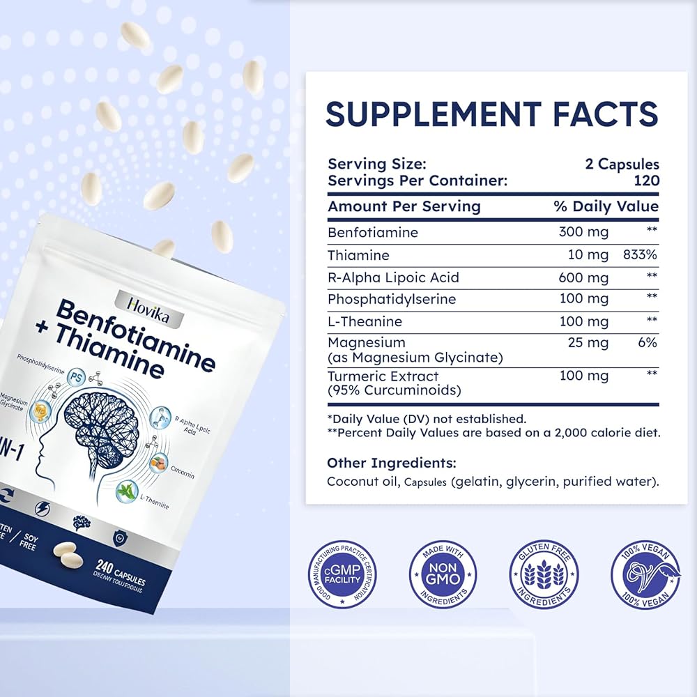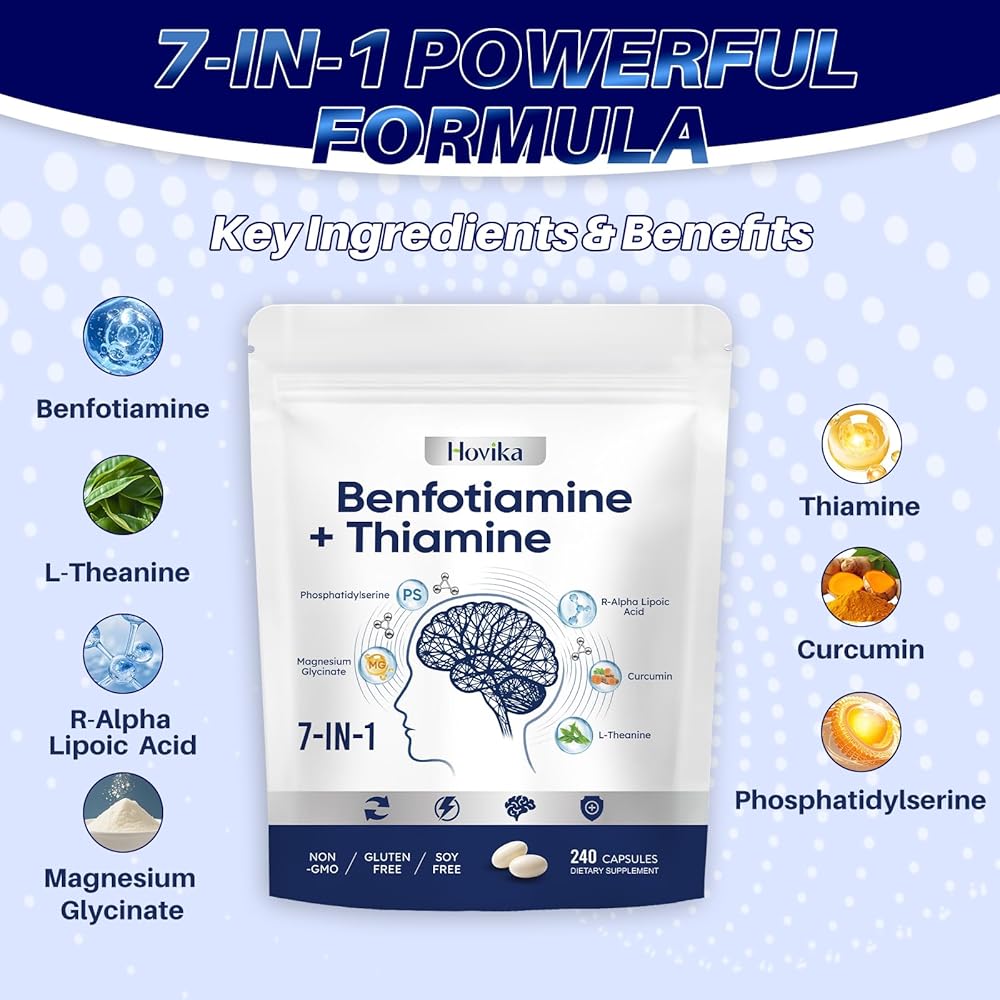 Advanced 7-in-1 Formula & Dosage: This advanced formula combines 300mg of high-bioavailability Benfotiamine with 600mg of R-Alpha Lipoic Acid per serving. It is further enhanced with 100mg of Phosphatidylserine, 100mg of L-Theanine, 100mg of Turmeric Extract (95% Curcuminoids), and 25mg of Magnesium Glycinate, creating a comprehensive neuro-support complex in just two capsule
