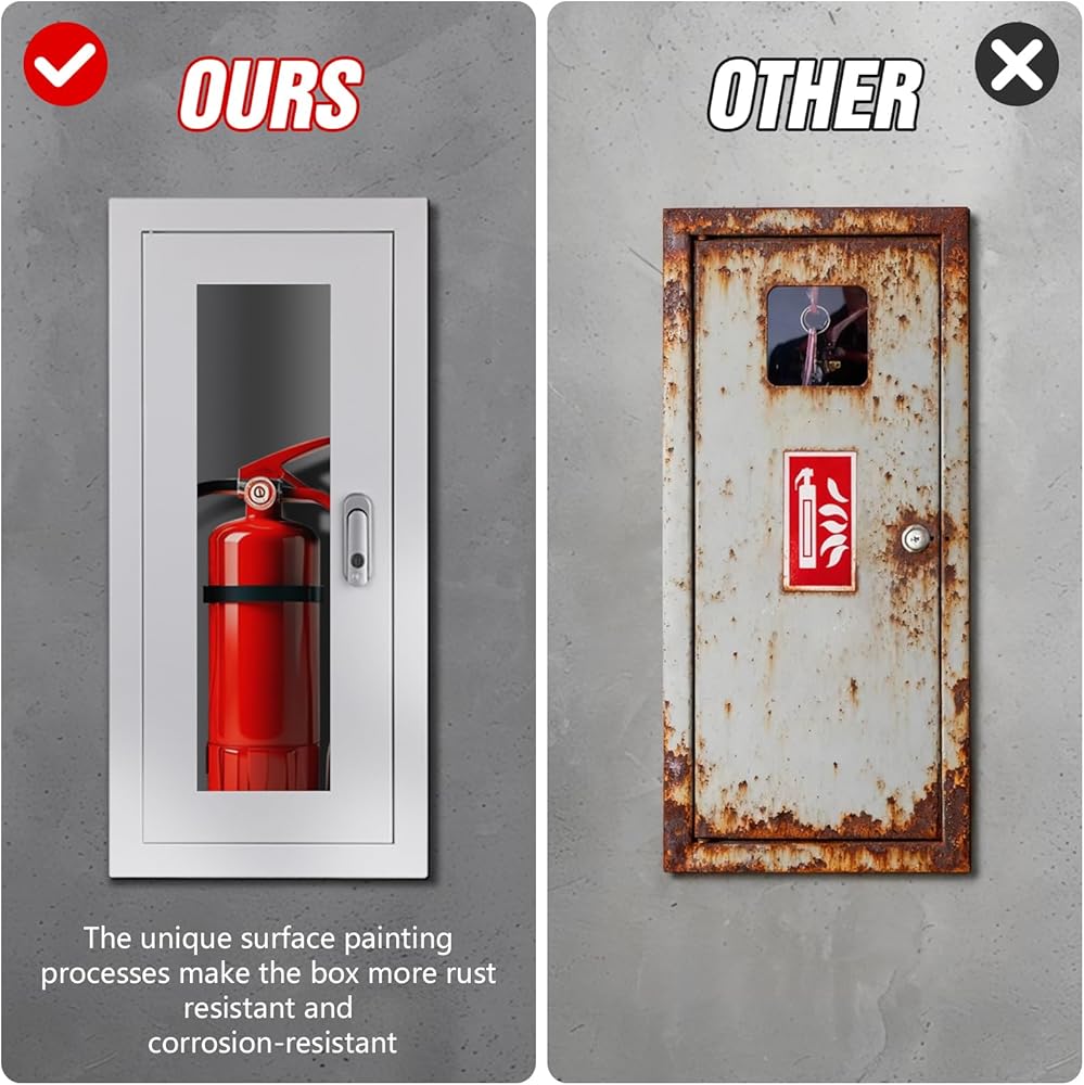 Excellent Materials:The embedded fire extinguisher cabinet is made of professional cold-rolled steel with a thickness of up to 0.04 inches /1mm. The surface has been polished and sprayed to prevent rust and surface scratches.You can use it safely indoors or outdoors.
