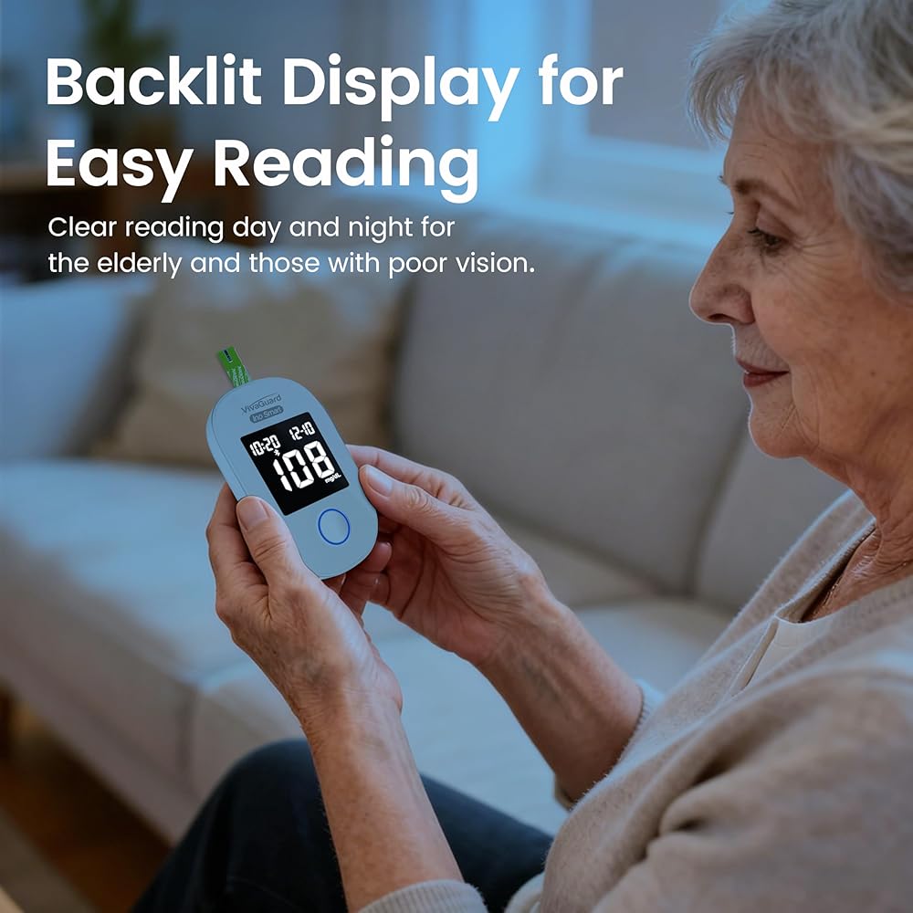 【Clear Backlit Display】: This glucose monitor features a screen designed for ultimate clarity. With large, high-brightness digits, your results are effortlessly clear in any lighting—from bright daylight to low-light nights. This thoughtful design is especially helpful for elderly users and those with visual impairments, ensuring accurate and easy reading every time.