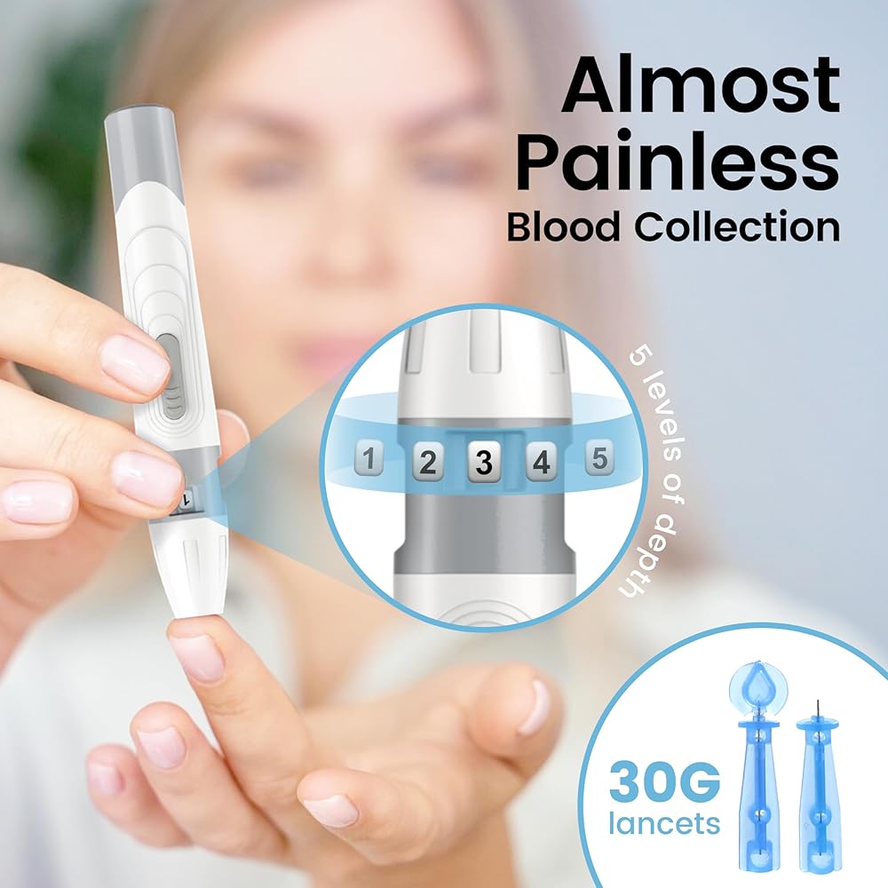 【No Coding and Almost Painless】:No coding needed and Results in Just 5 Seconds. Get clear, precise readings with a tiny 0.8μL blood sample. For maximum comfort, it's paired with a 5-depth adjustable lancing device and 30G lancets, letting you customize the stick for your skin type to minimize discomfort.