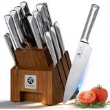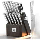 16-Piece Complete Set with FSC-Certified Wooden Block This all-in-one professional knife set includes 8" chef knife, 8" bread knife, 8" slicing knife, 7" santoku knife, 6" boning knife, 5" utility knife, 3.5" paring knife, 6pcs 4.5" serrated steak knives, multi-purpose shears, a knife sharpener, and a stylish storage block. The block is crafted from FSC-certified wood with a fine non-stick coating and ventilated bottom, ensuring durable, space-saving, and hygienic organization for any kitchen.