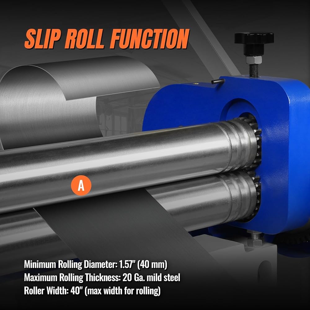 Slip Roll Capacity: Handles rolling of 20 Ga. mild steel, with a minimum rolling diameter of 1.53" (39 mm), ideal for creating cylinders, cones, and arcs.